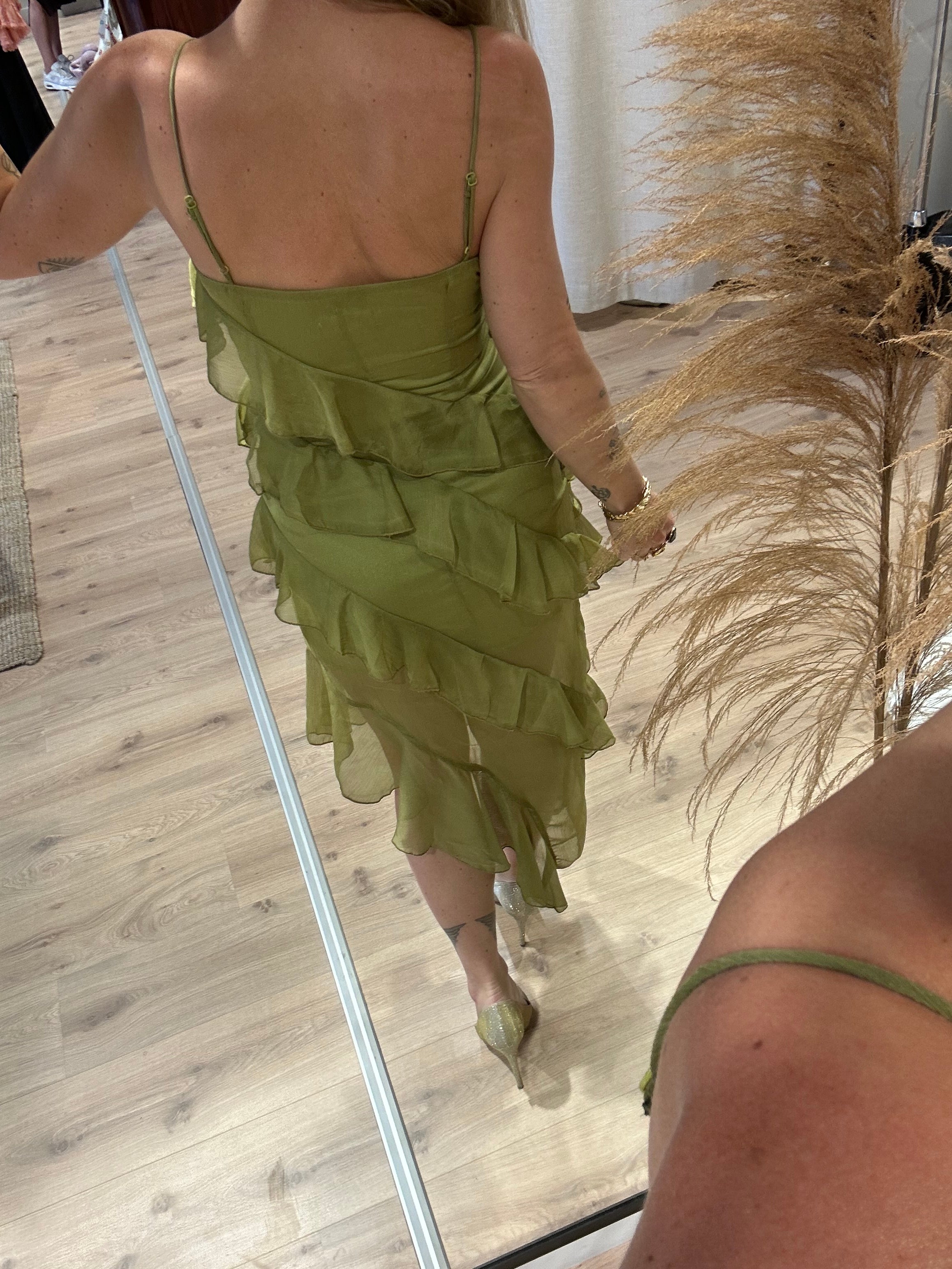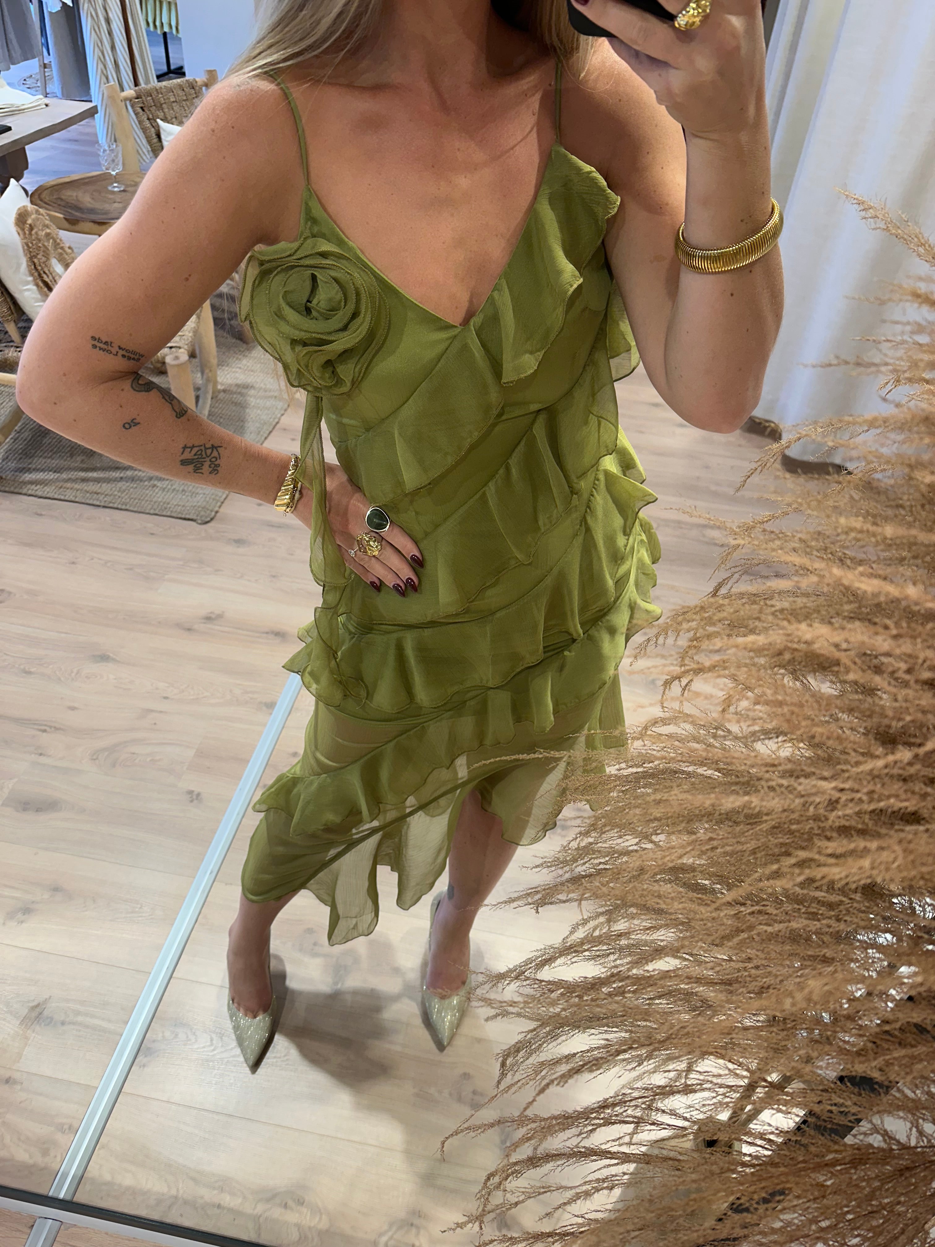 Asymmetrische jurk met volants groen | Kate