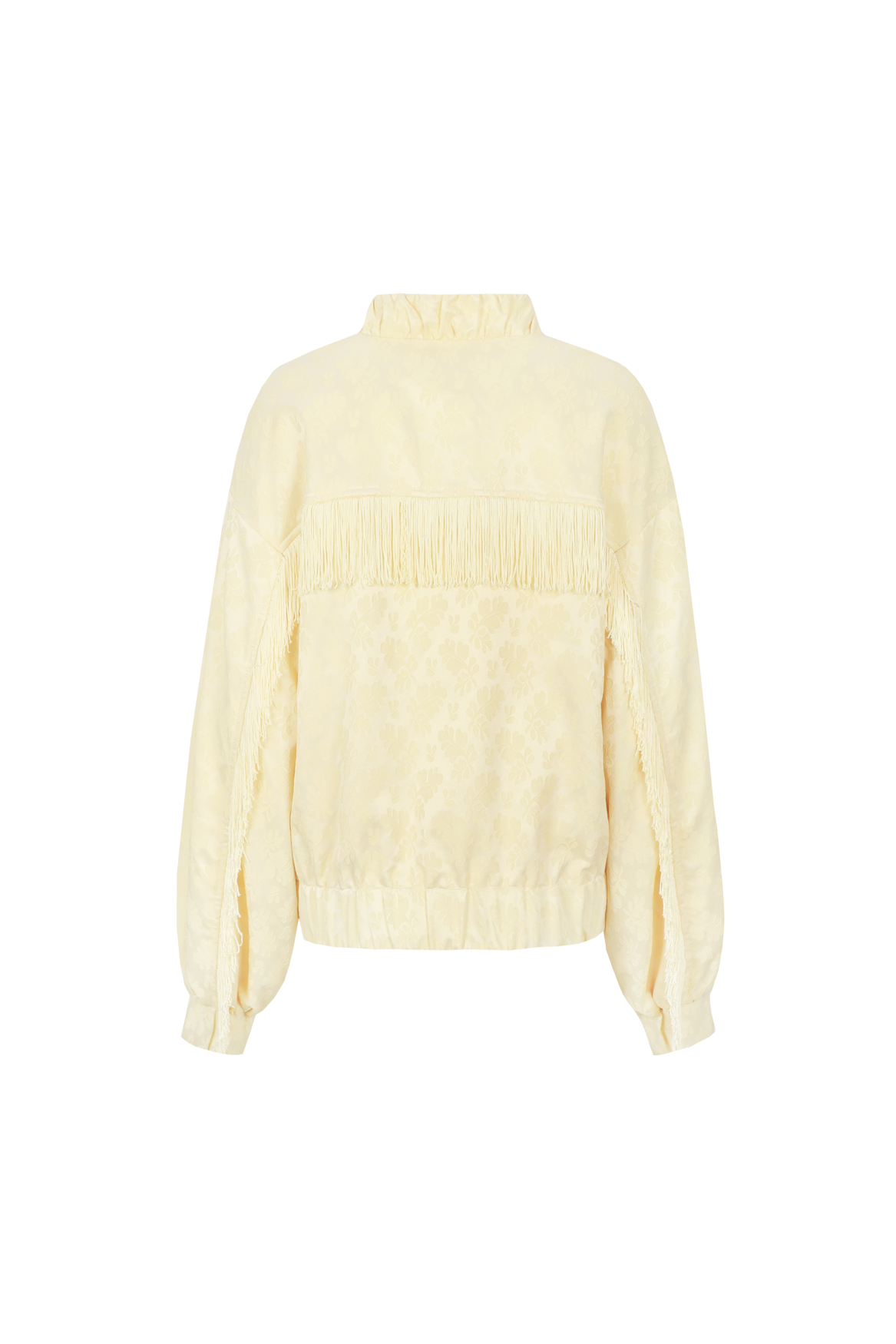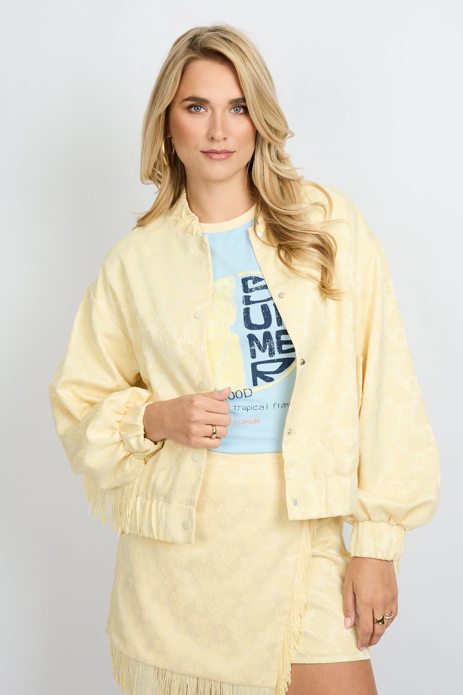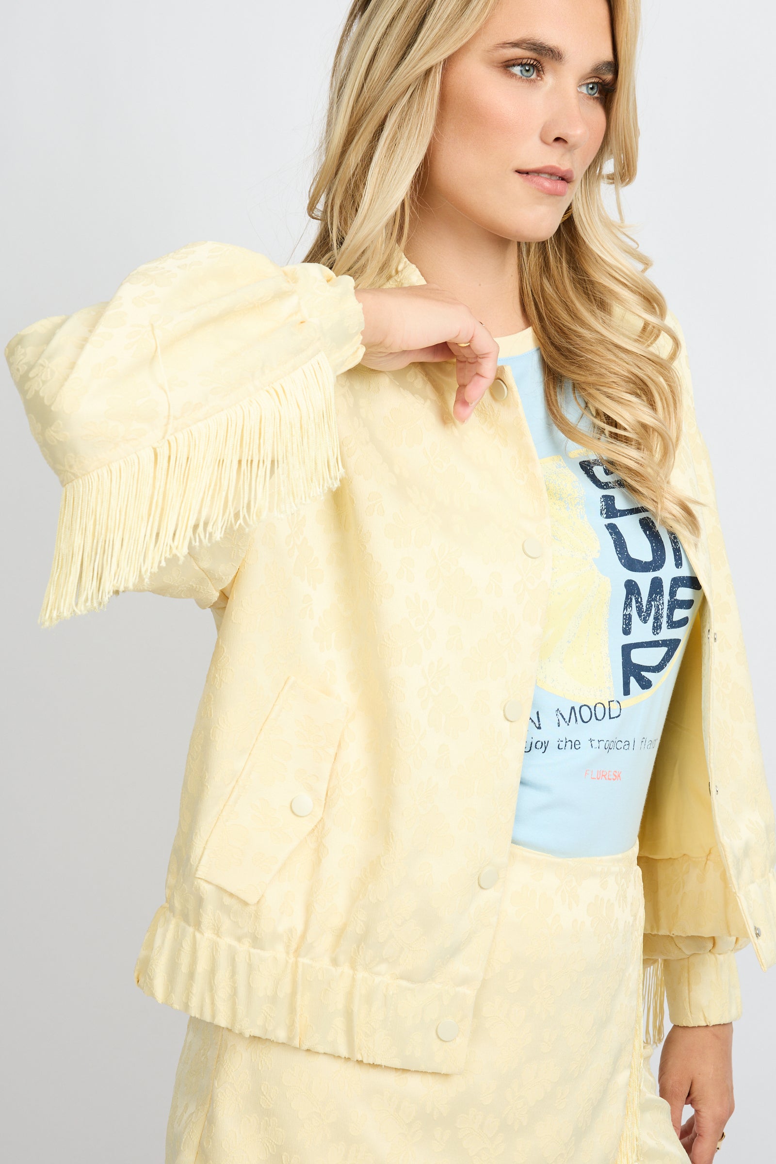 Soft romance meets cool details. De MARENA JACKET heeft een korte, licht boxy fit en een subtiele bloemenprint die zorgt voor een elegante uitstraling. De franjes op de mouwen geven een speelse western touch en maken ’m net even anders. Dankzij de elastische zoom sluit hij mooi aan en draagt hij comfortabel. Combineer ’m met een pantalon voor een classy look of draag ’m casual over een tee. Delicate, maar met karakter.