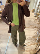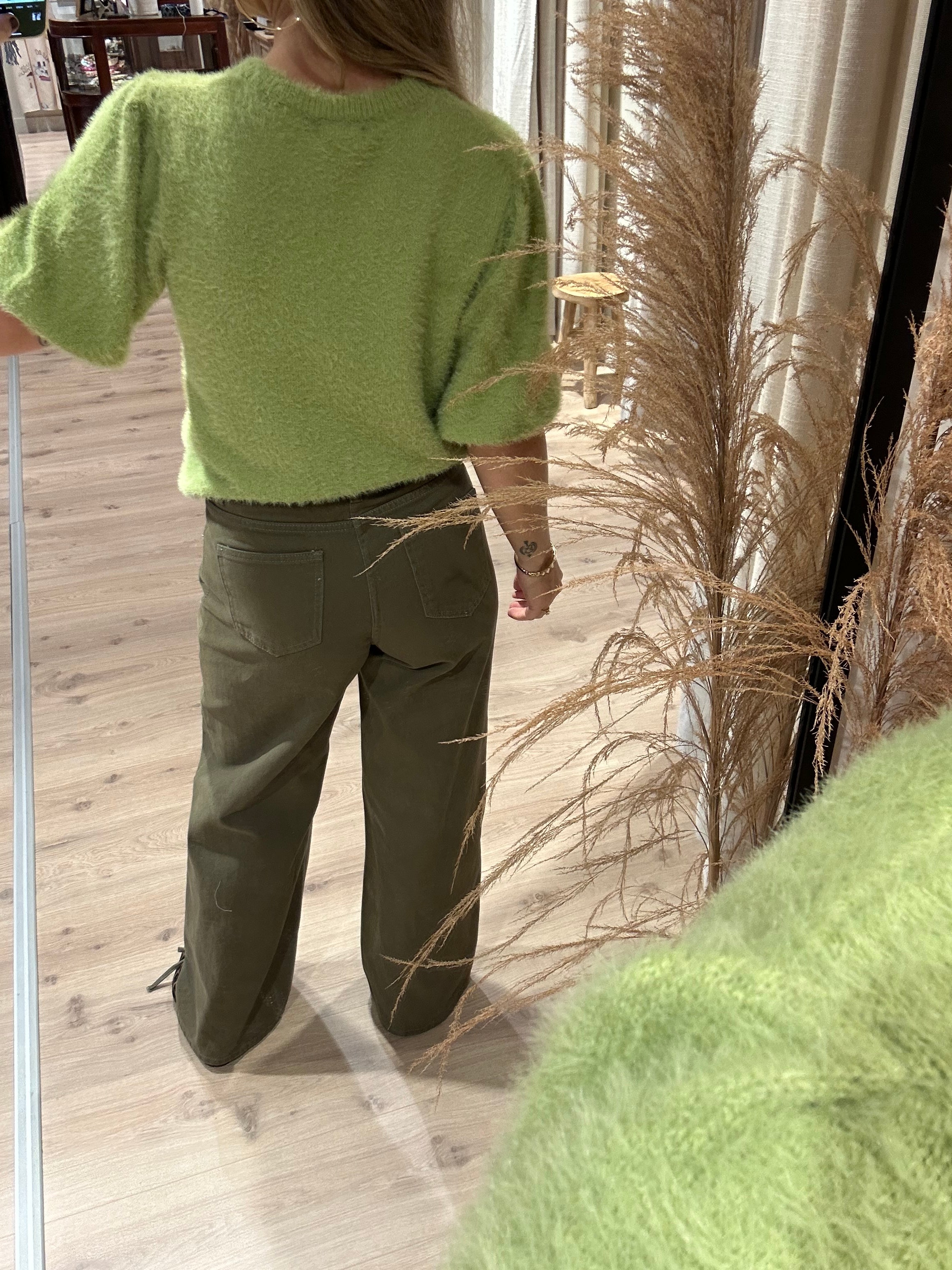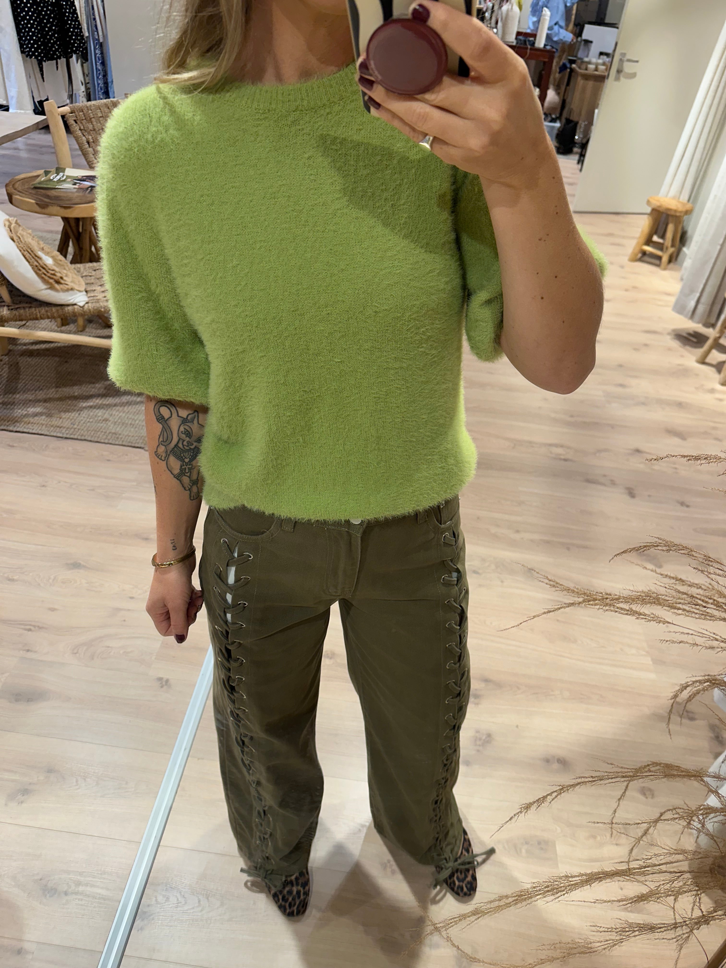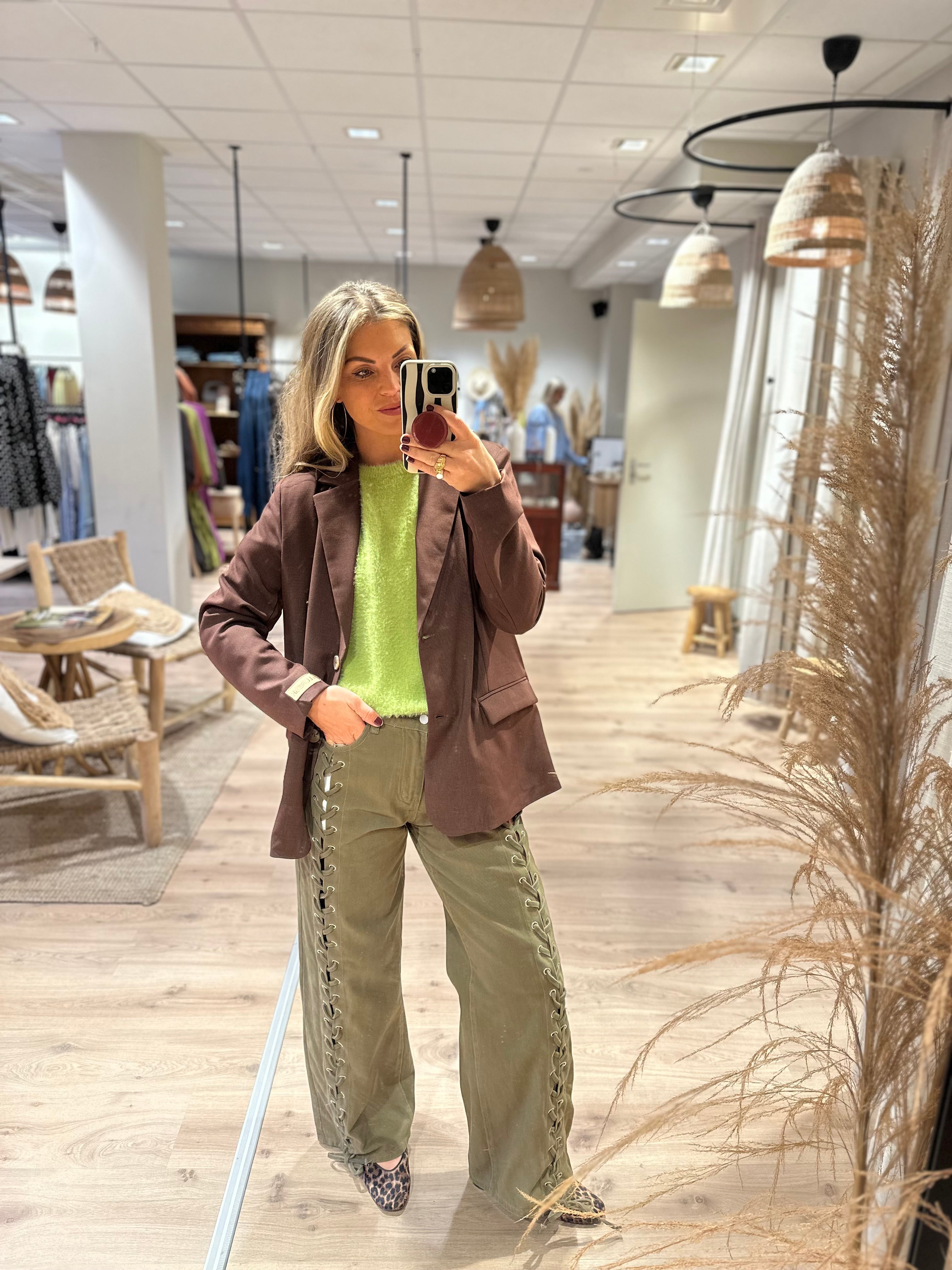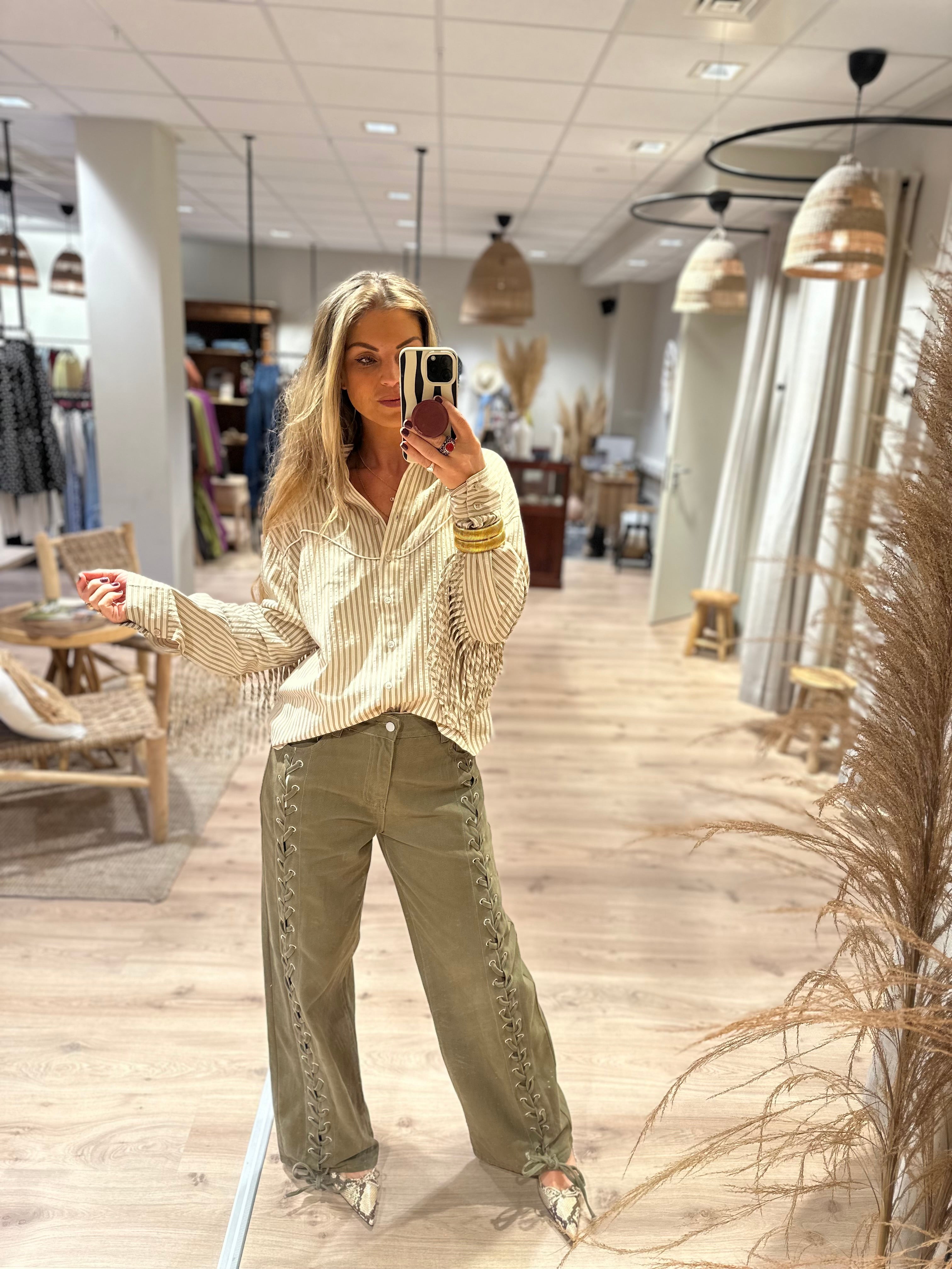 Een wijde jeans met veter detail van boven tot onder. De jeans heeft voor en achterzakken.