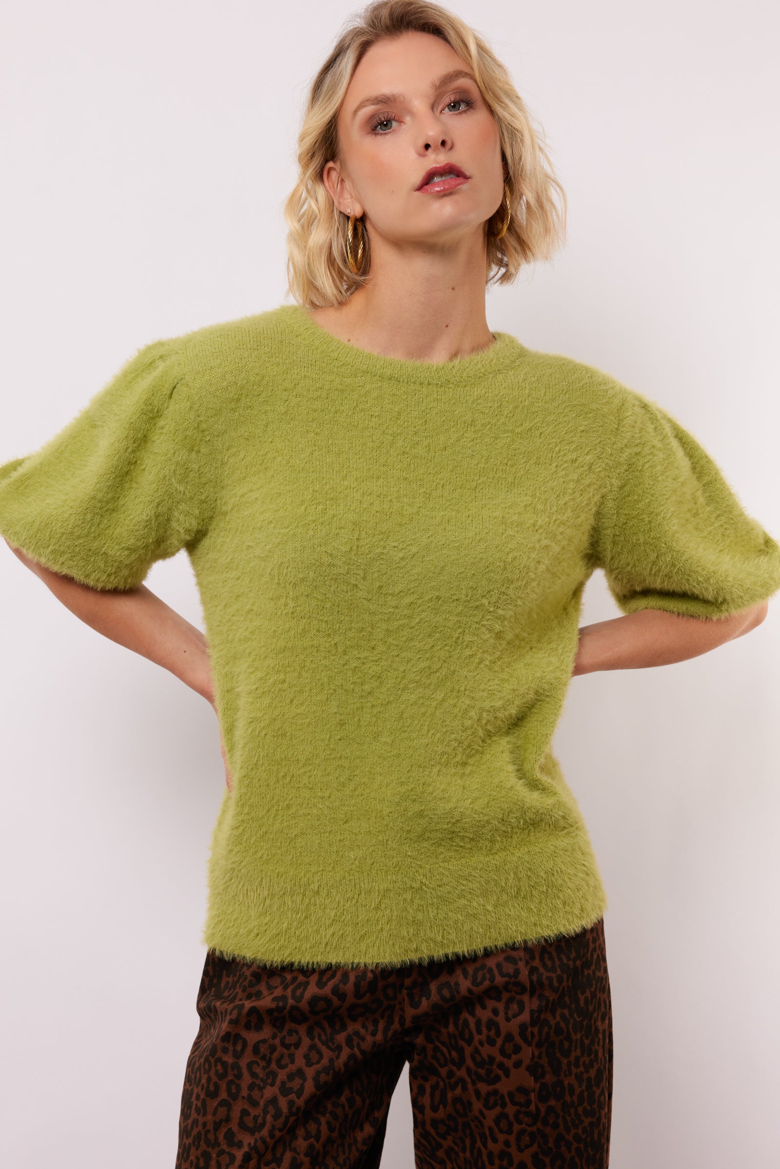 De MORAINE KNIT TOP is de basic die allesbehalve basic voelt. Met z’n fluffy stof, korte pofmouw en ronde hals is dit item jouw geheime wapen voor elke cozy, speelse of funky look. Draag ‘m solo of onder een gilet, mix met denim of ga voor print – MORAINE got you covered.