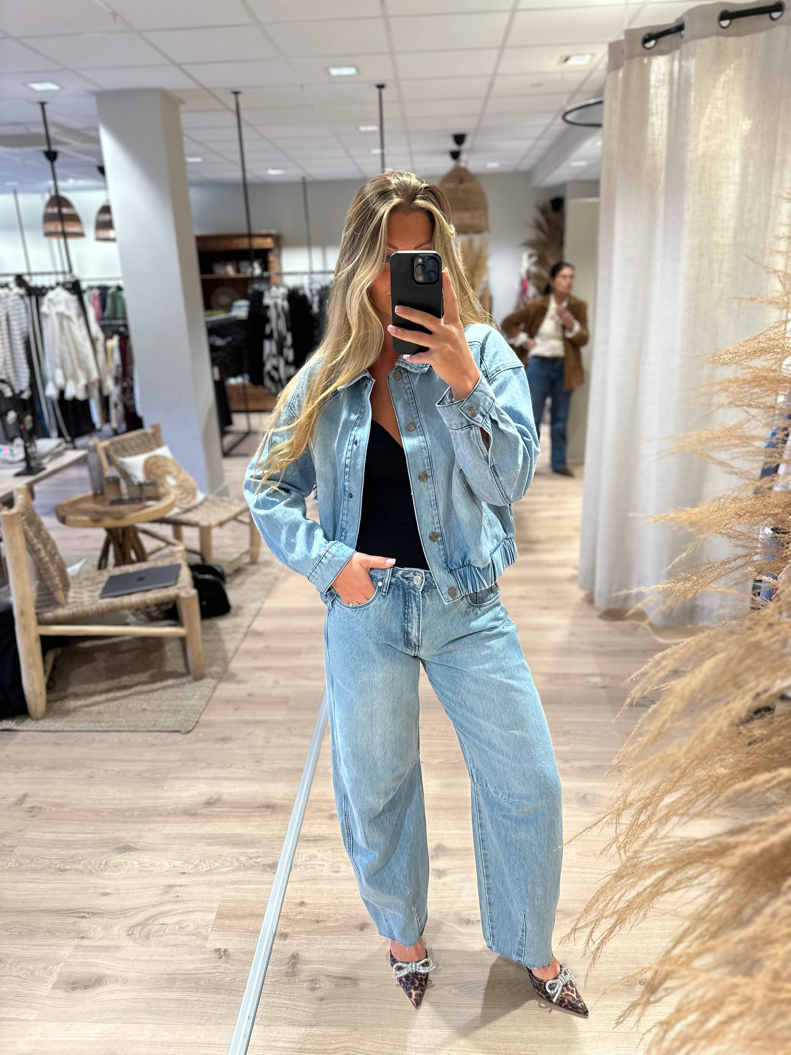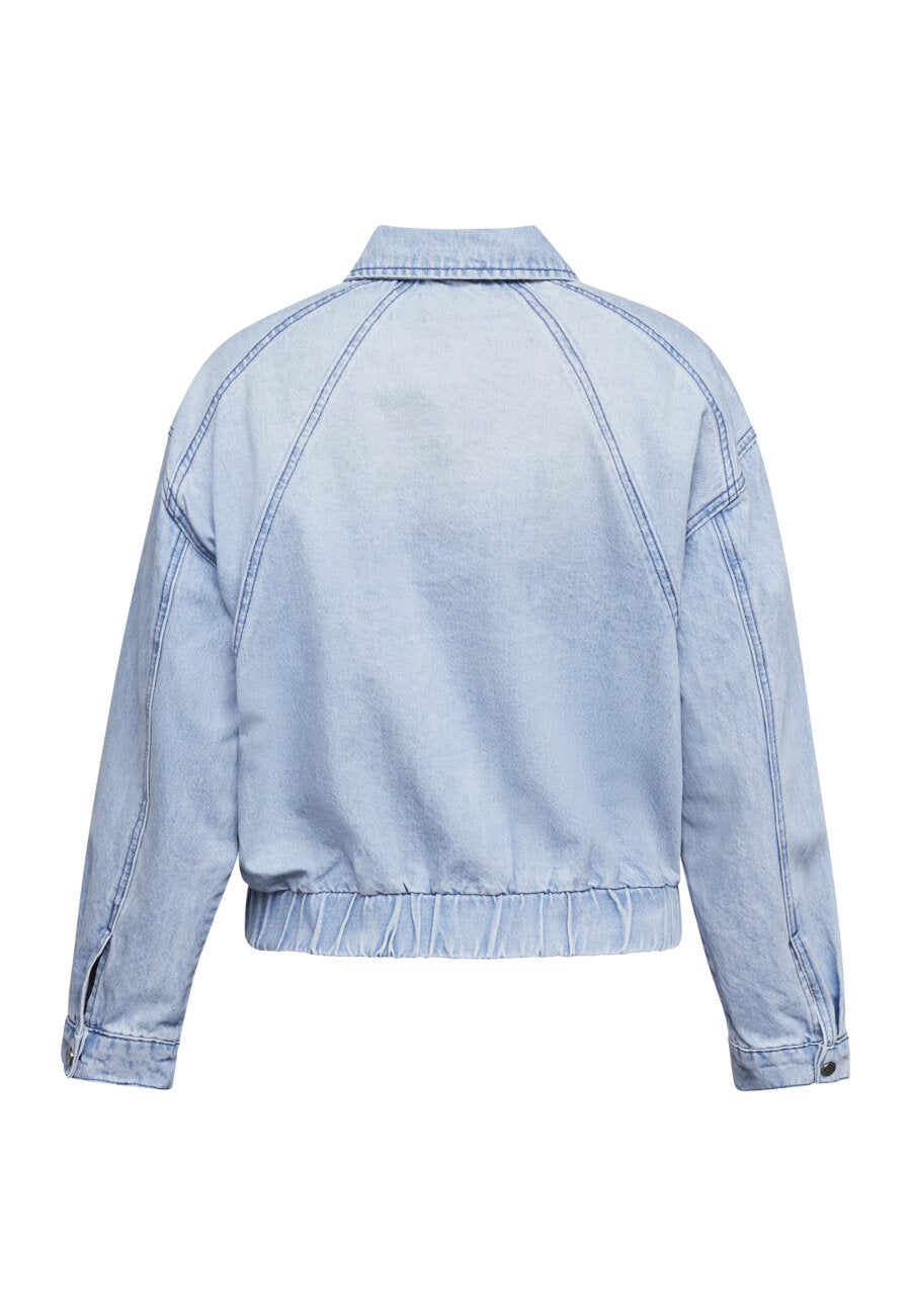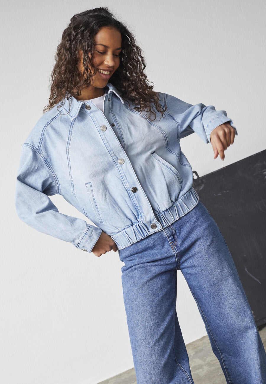 FEY-JA is een stoer en casual spijkerjasje met een moderne twist. De jas heeft een kraag, knoopsluiting en lange mouwen. Het heeft een losse pasvorm en een afgeronde taille met elastiek voor extra comfort.