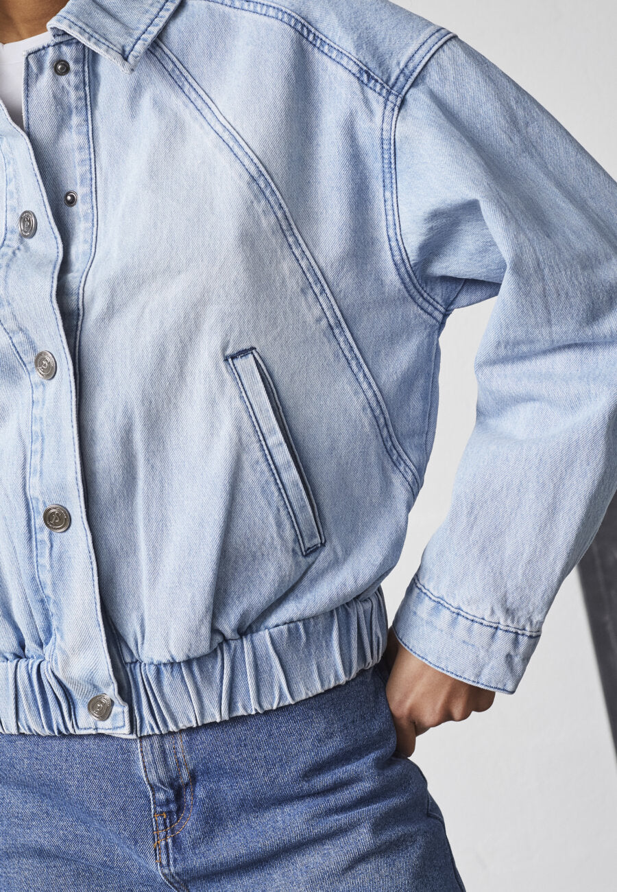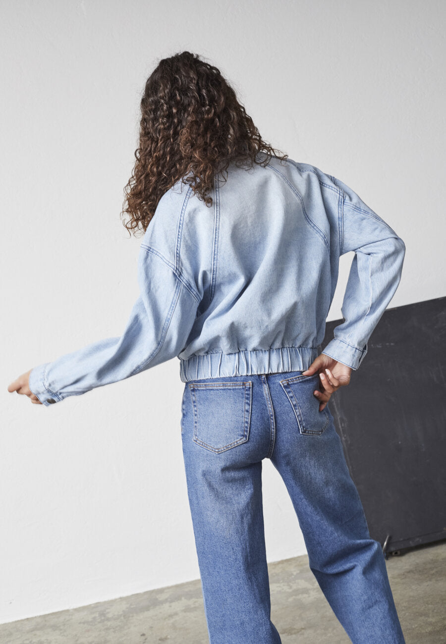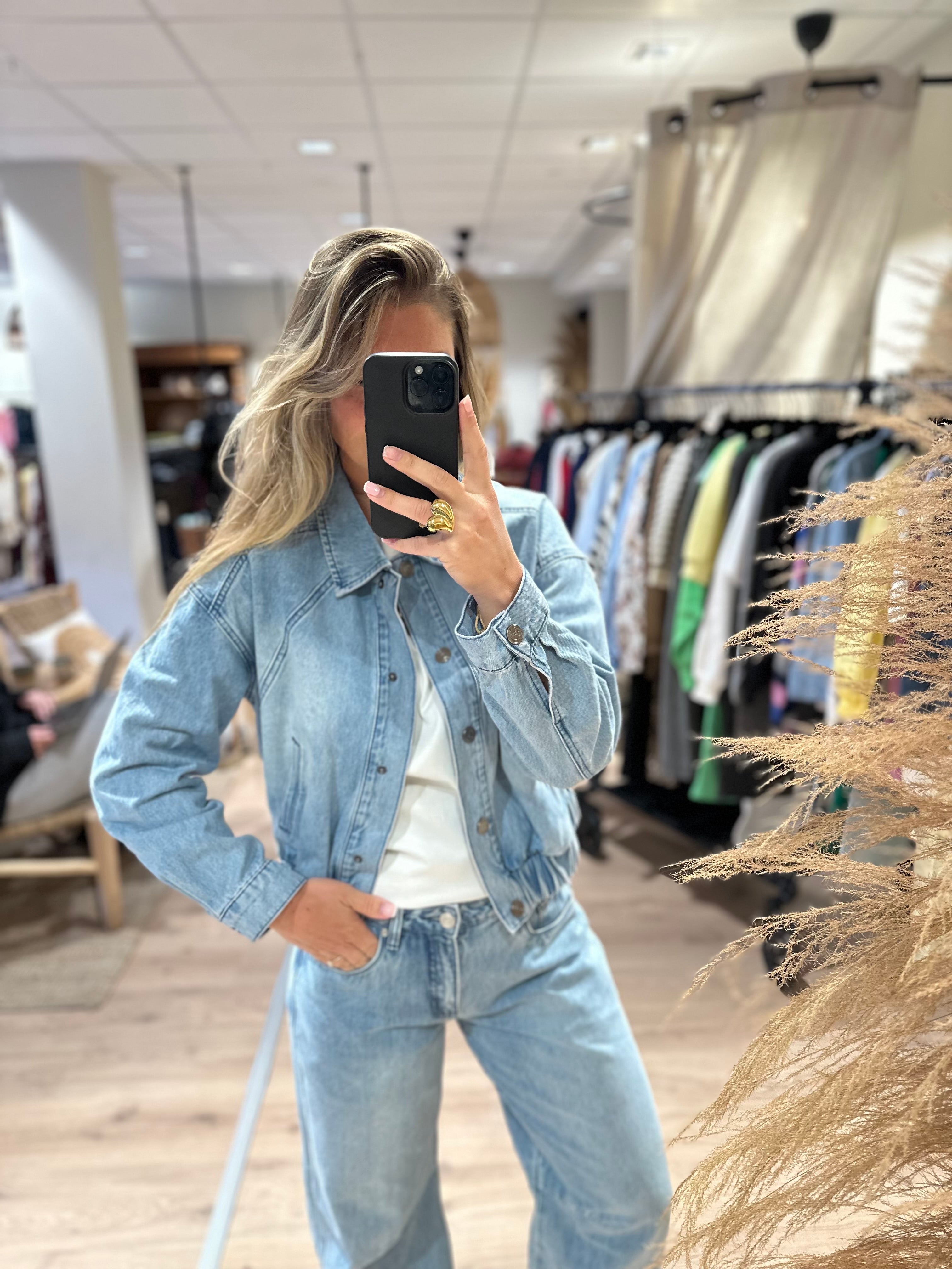 FEY-JA is een stoer en casual spijkerjasje met een moderne twist. De jas heeft een kraag, knoopsluiting en lange mouwen. Het heeft een losse pasvorm en een afgeronde taille met elastiek voor extra comfort.
