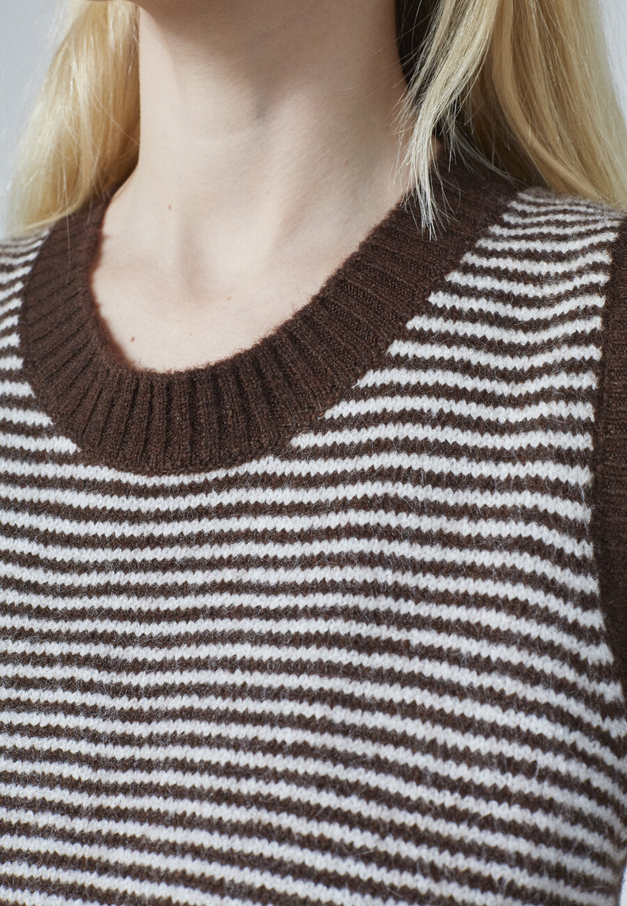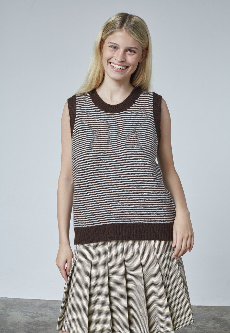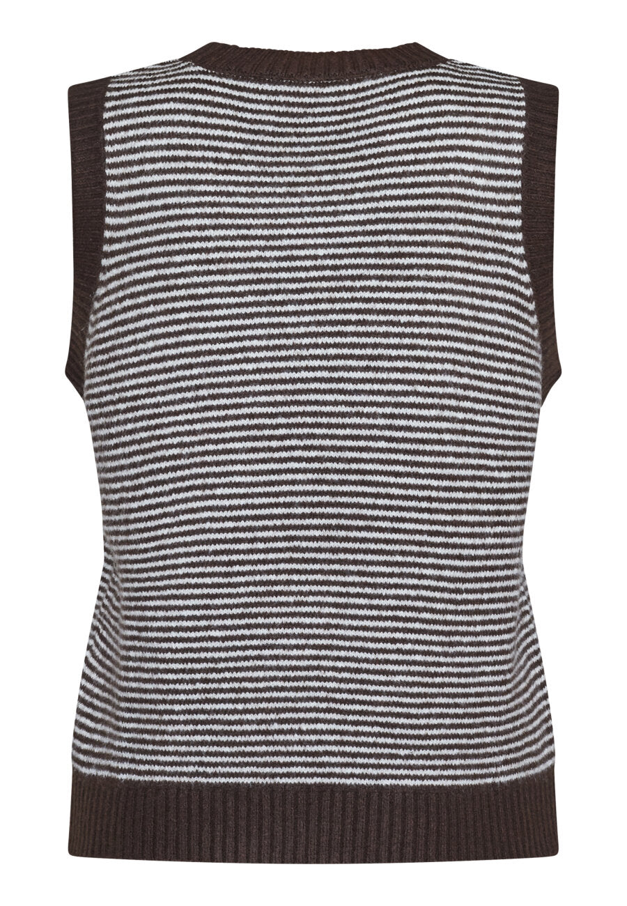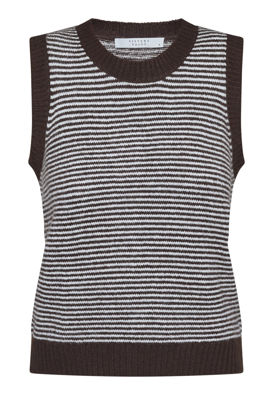 MEGI-VE is een gebreide spencer met een ronde hals en geribbelde randen. Het vest heeft een horizontaal gestreept patroon dat een klassieke en ontspannen uitstraling biedt.