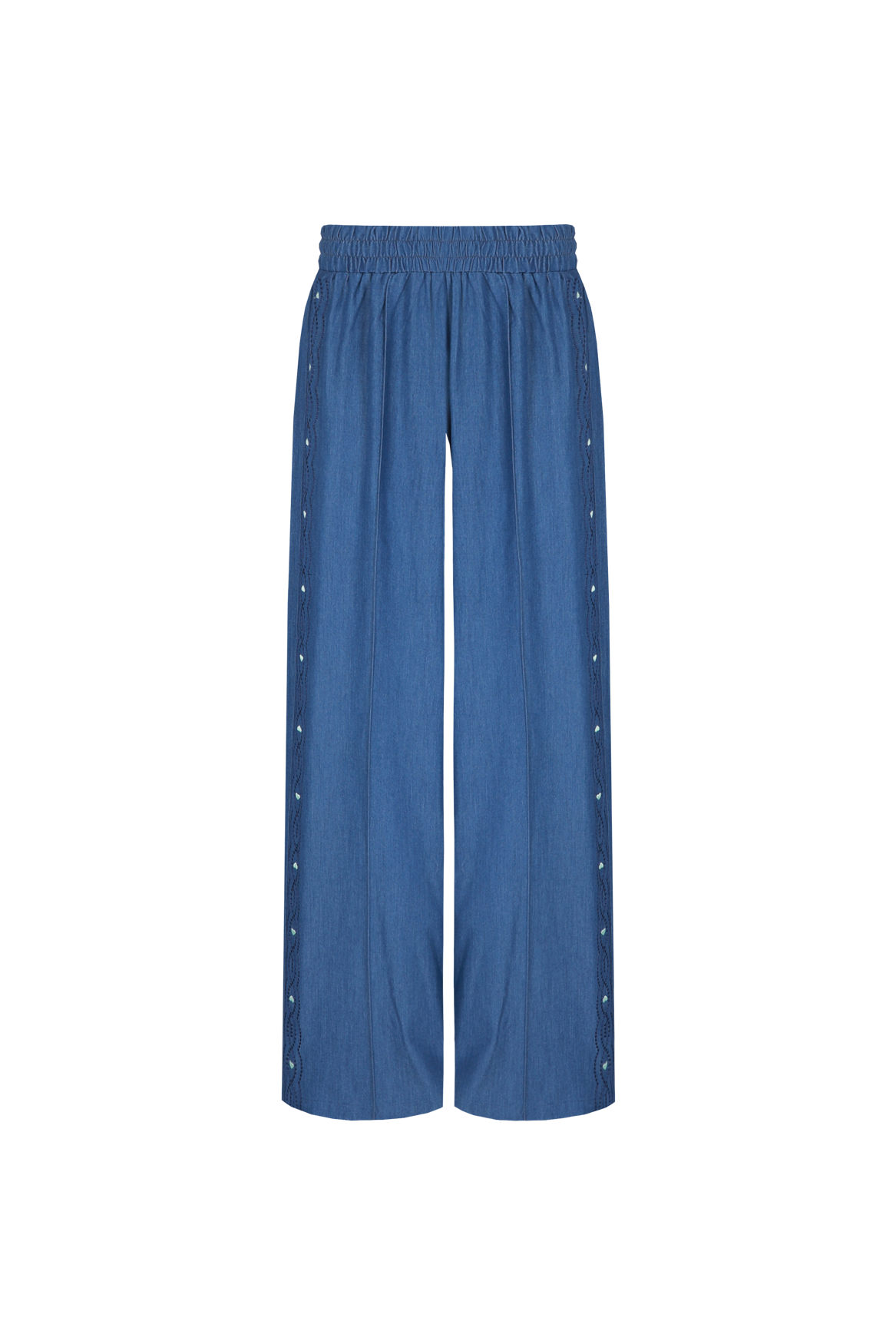 De NYRAH BROEK is jouw nieuwe go-to voor laidback days. Deze wide leg denim heeft een zachte wassing en een high waist met elastiek aan de achterkant voor extra comfort. Draag met een kleurrijke top of maak er een co-ord van met het BIJPASSENDE JACK, instant outfit, zero effort.FLURESK denim broek net borduursel blauw | Nyrah