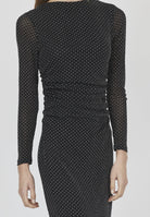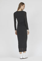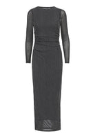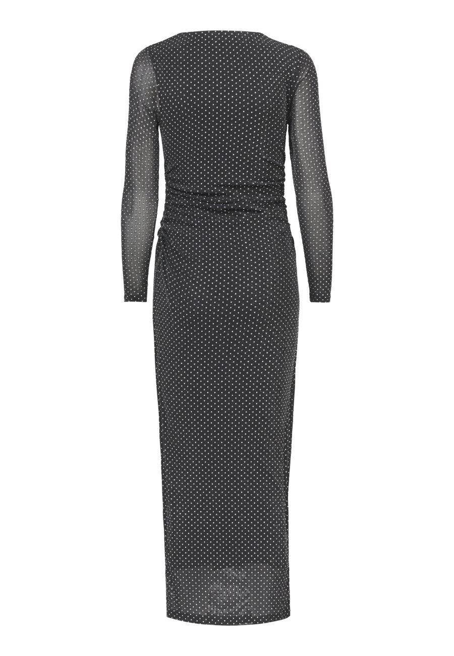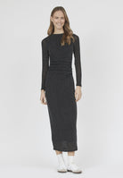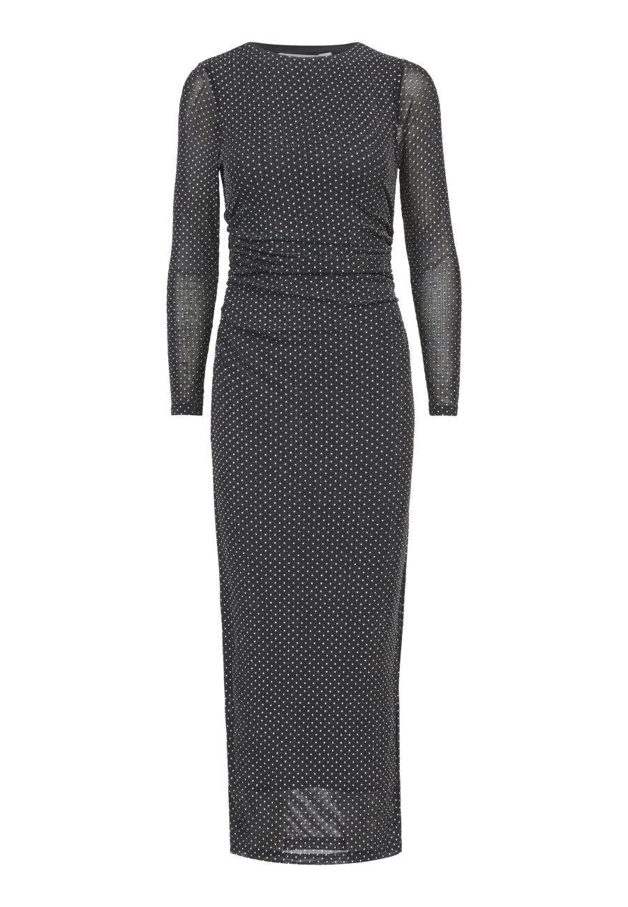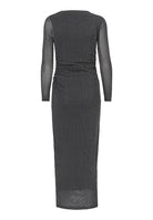 ESME-DR.LS5 is een lange glitterjurk met gaas en een vastgenaaide onderrok, alleen de mouwen zijn doorzichtig. De jurk heeft plooien in de taille en is gedetailleerd met kleine zilveren studs.
