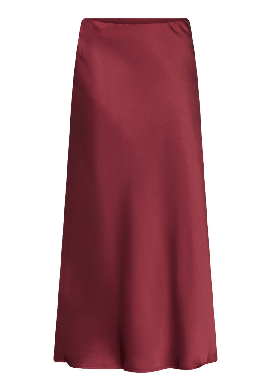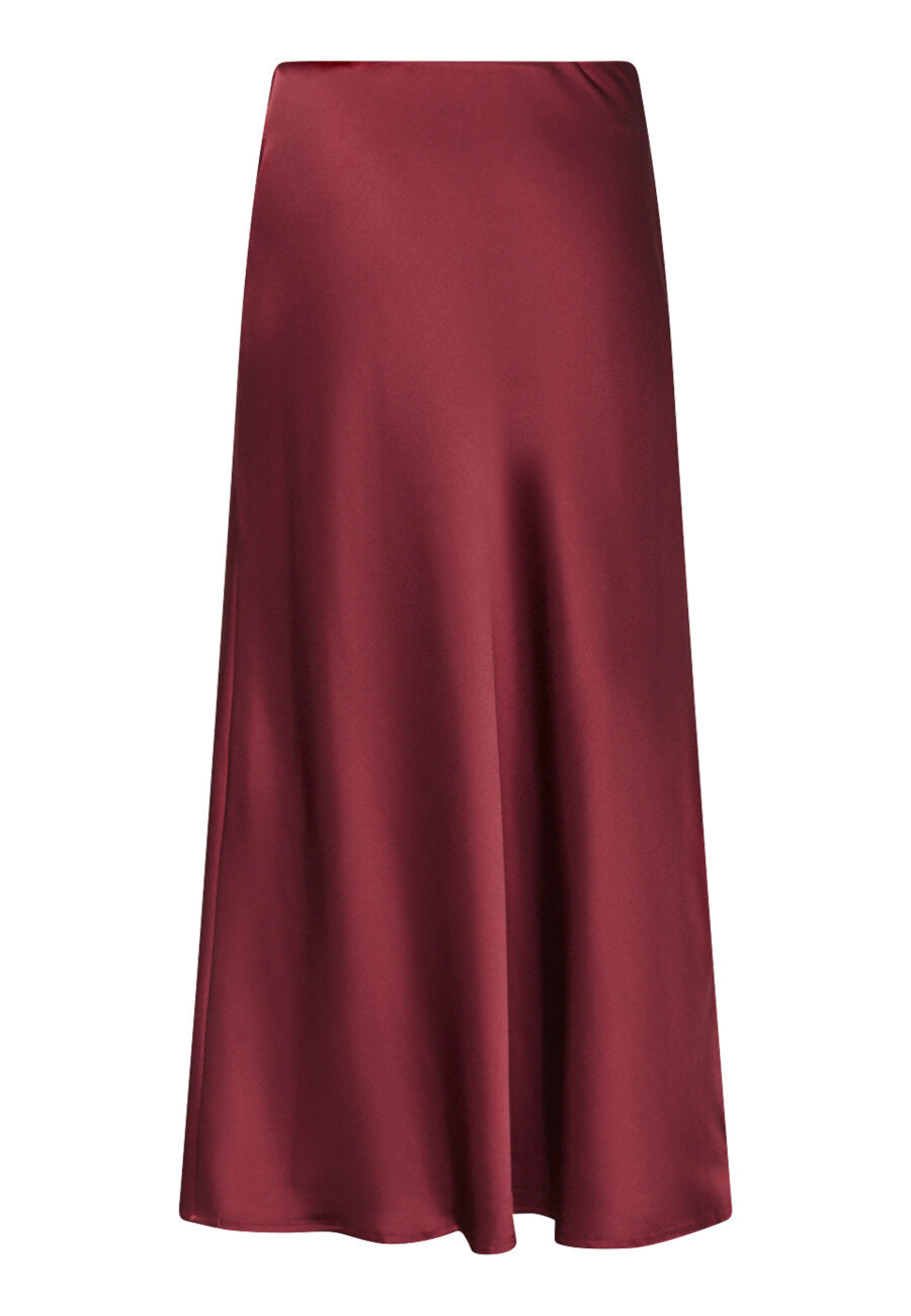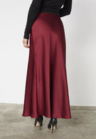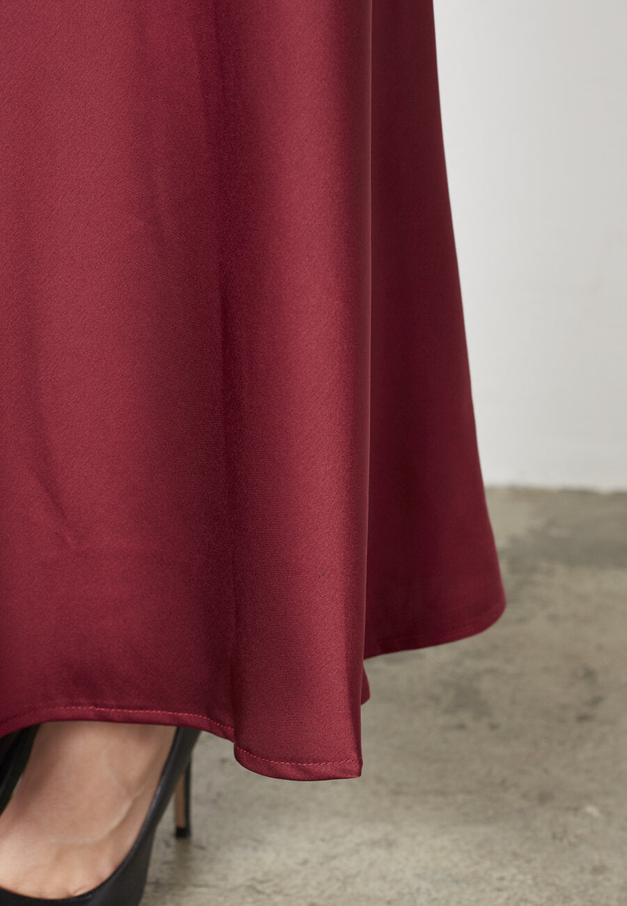 N.GEWO-SK1 is een lange rok van effen satijn. De rok heeft een elastiek in de taille en valt losjes aan de onderkant.