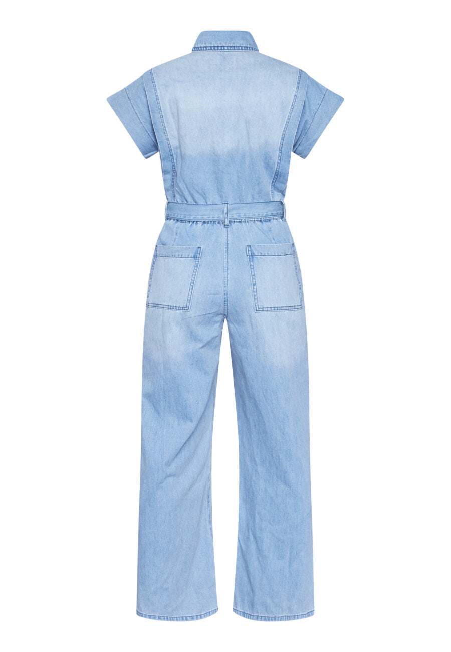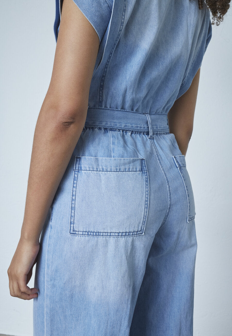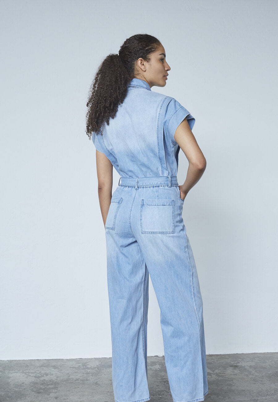 FEBA-JU is een denim jumpsuit met korte mouwen, een kraag en een volledige knoopsluiting aan de voorkant. Het heeft een verstelbare taille met een strik en praktische achterzakken.