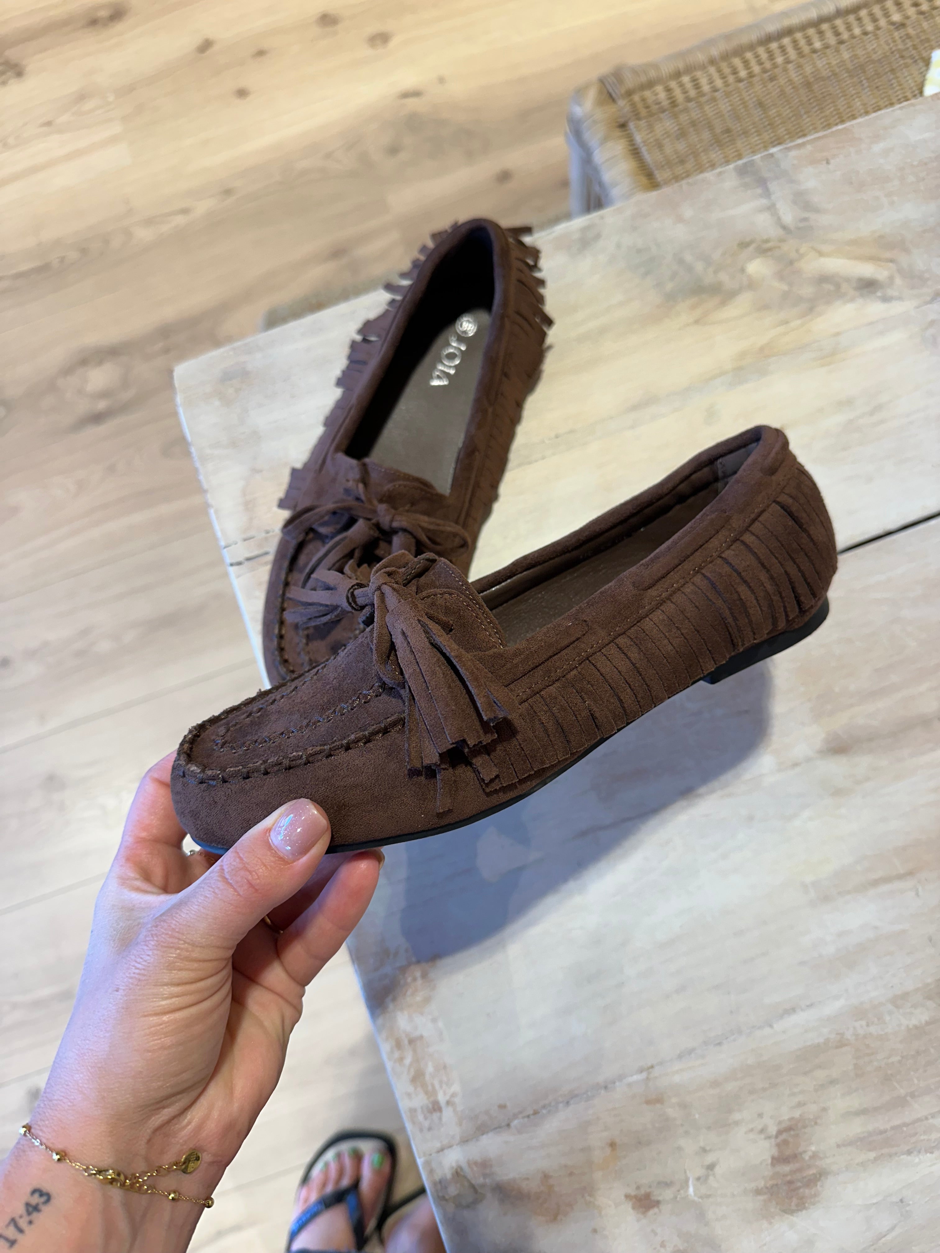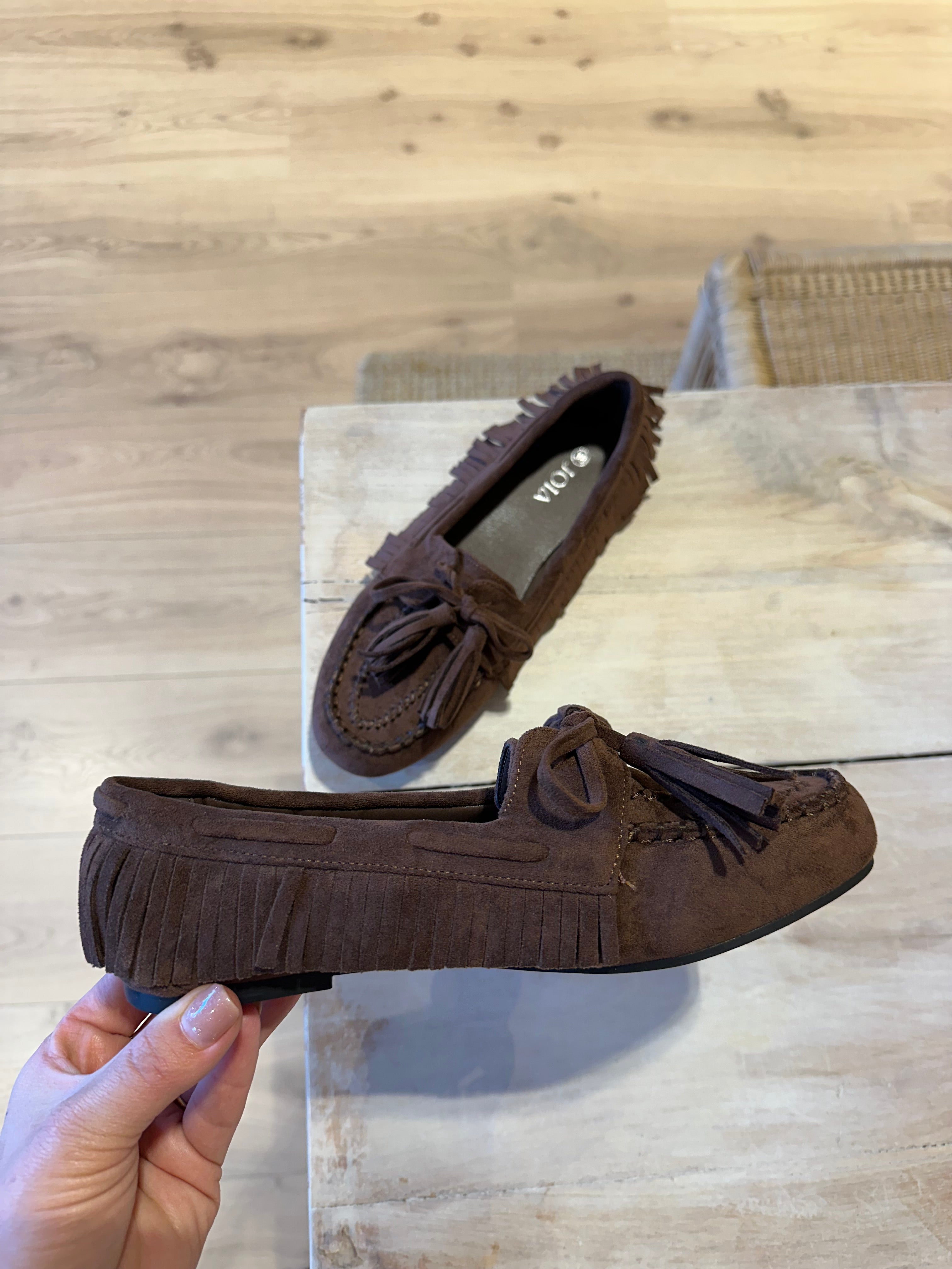 Faux suède mocassins met franje bruin | Winnie