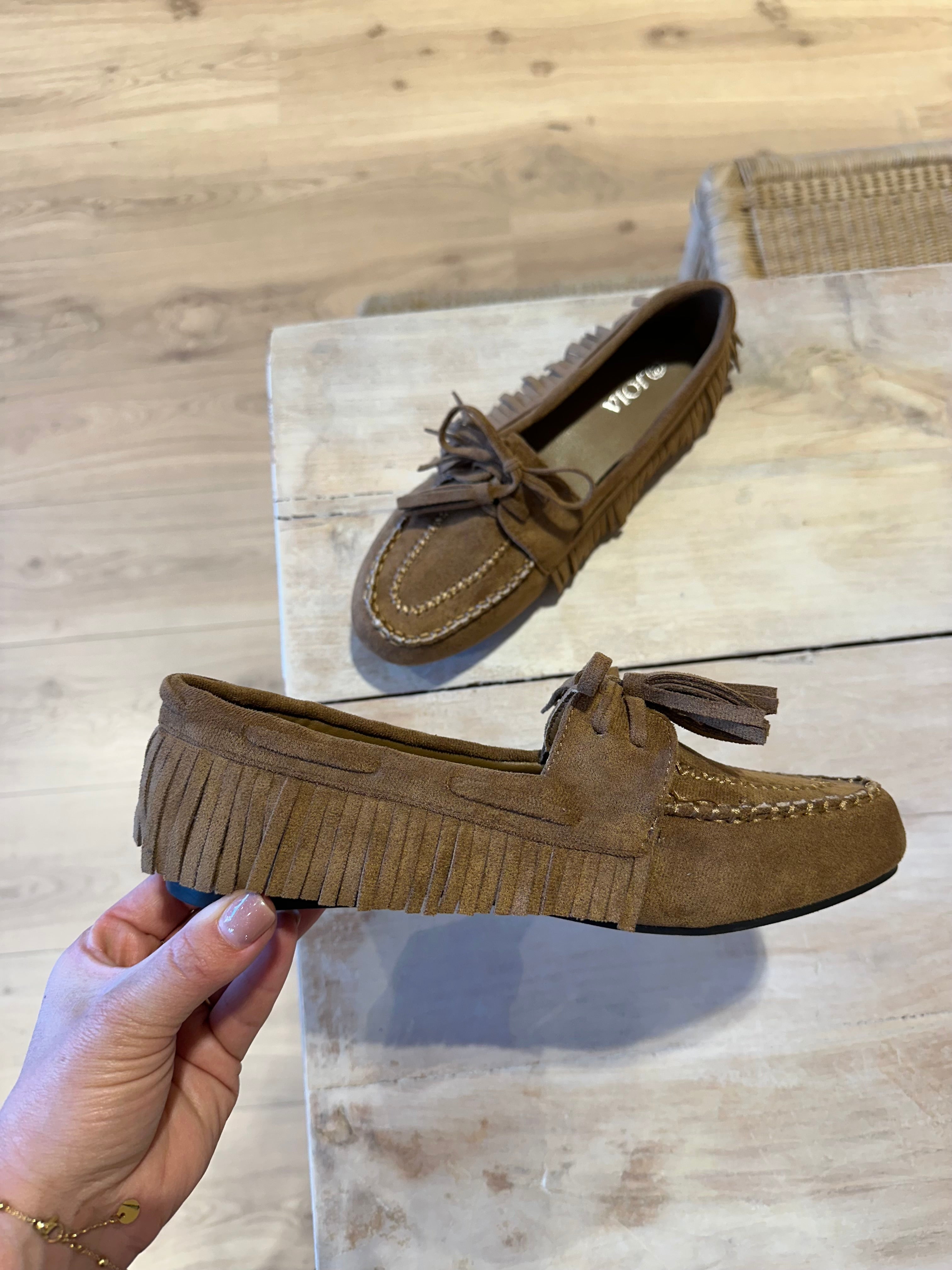 Faux suède mocassins met franje camel | Winnie