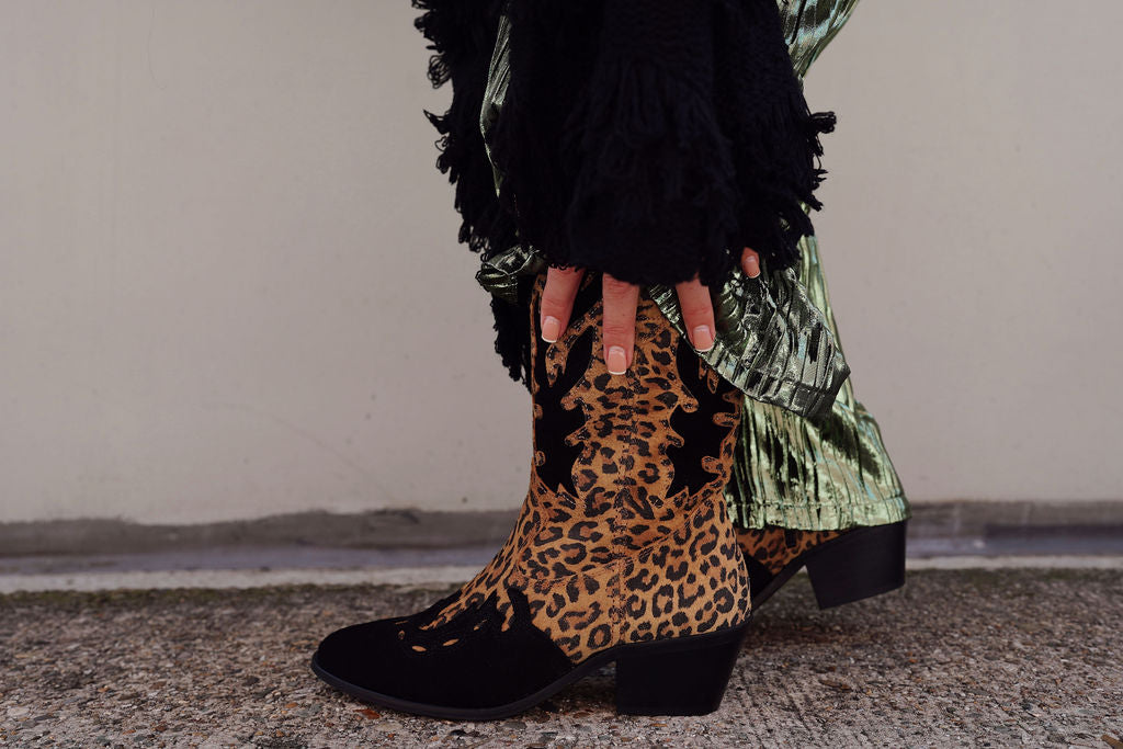 Deze stoere laarsjes met een western look in zwart / leapard voor dames zijn aan de buitenzijde van suède en aan de binnenzijde van leer. Dit artikel heeft een rits.
