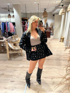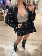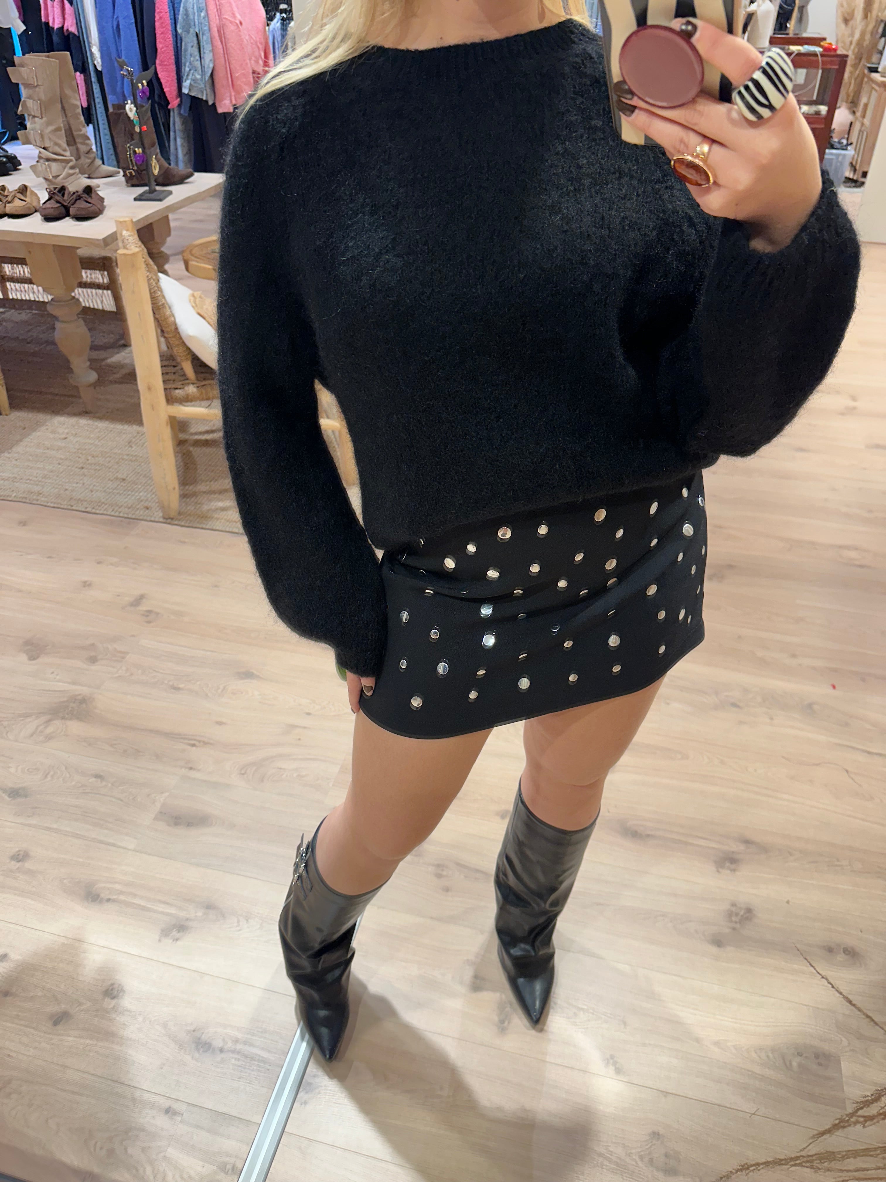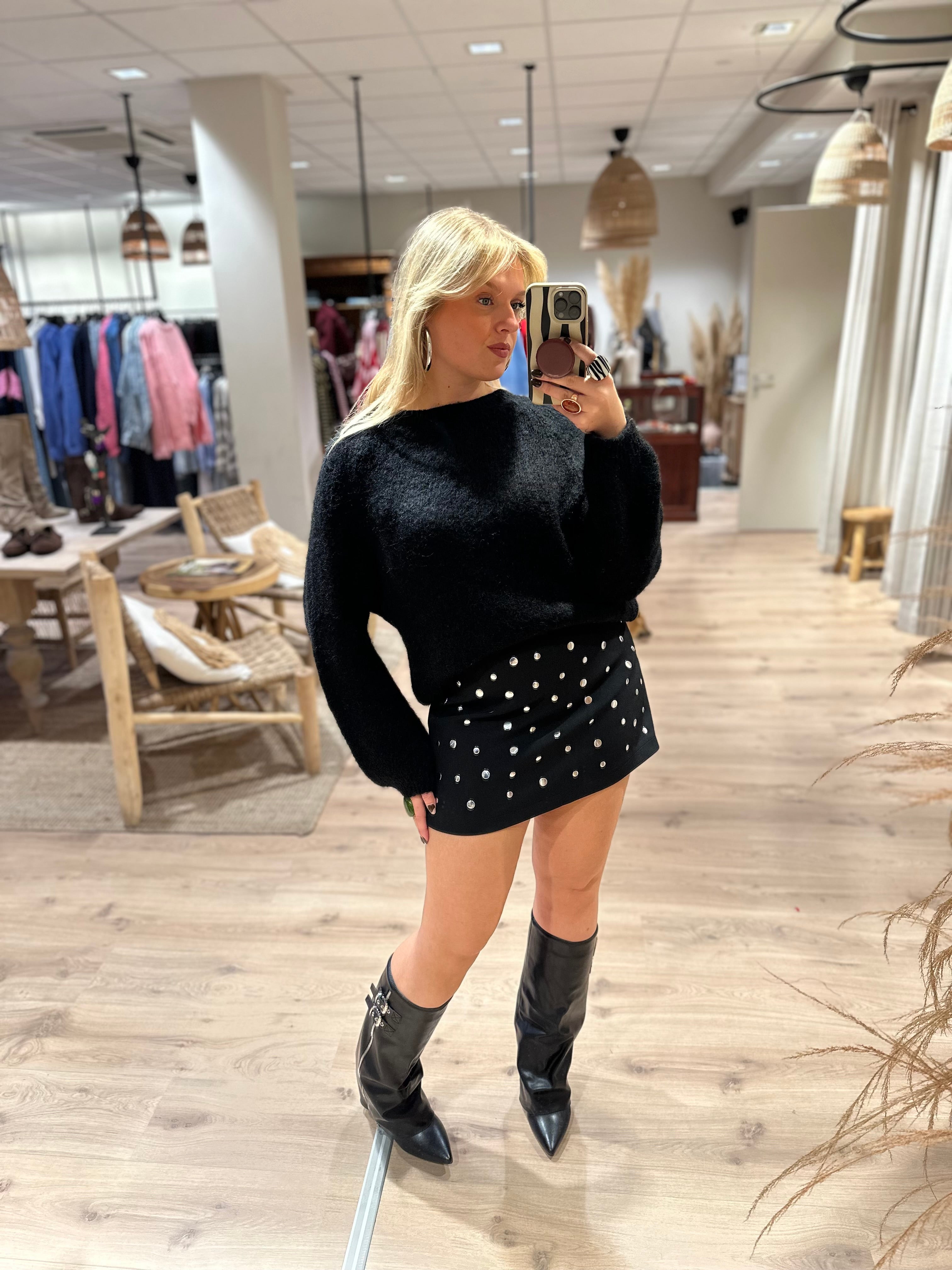 Een skort met studs aan de voorkant. De skort heeft een ritssluiting aan de zijkant