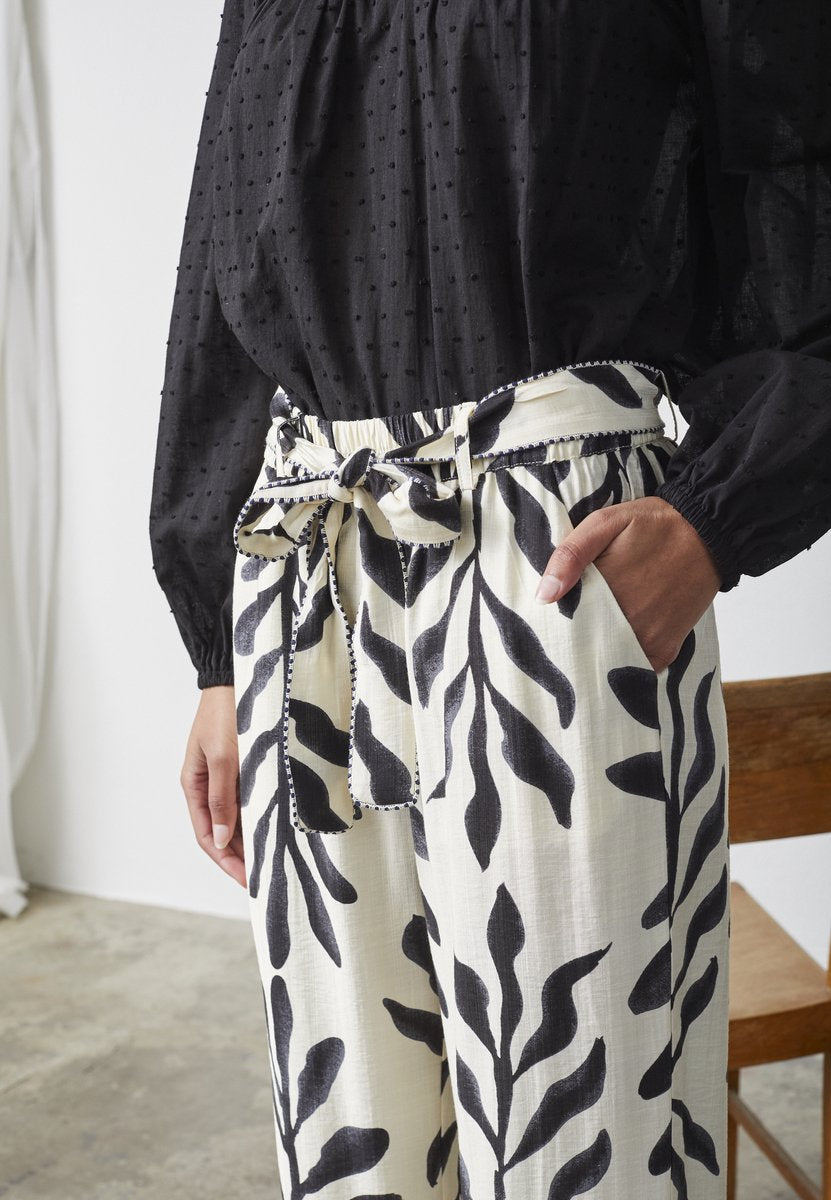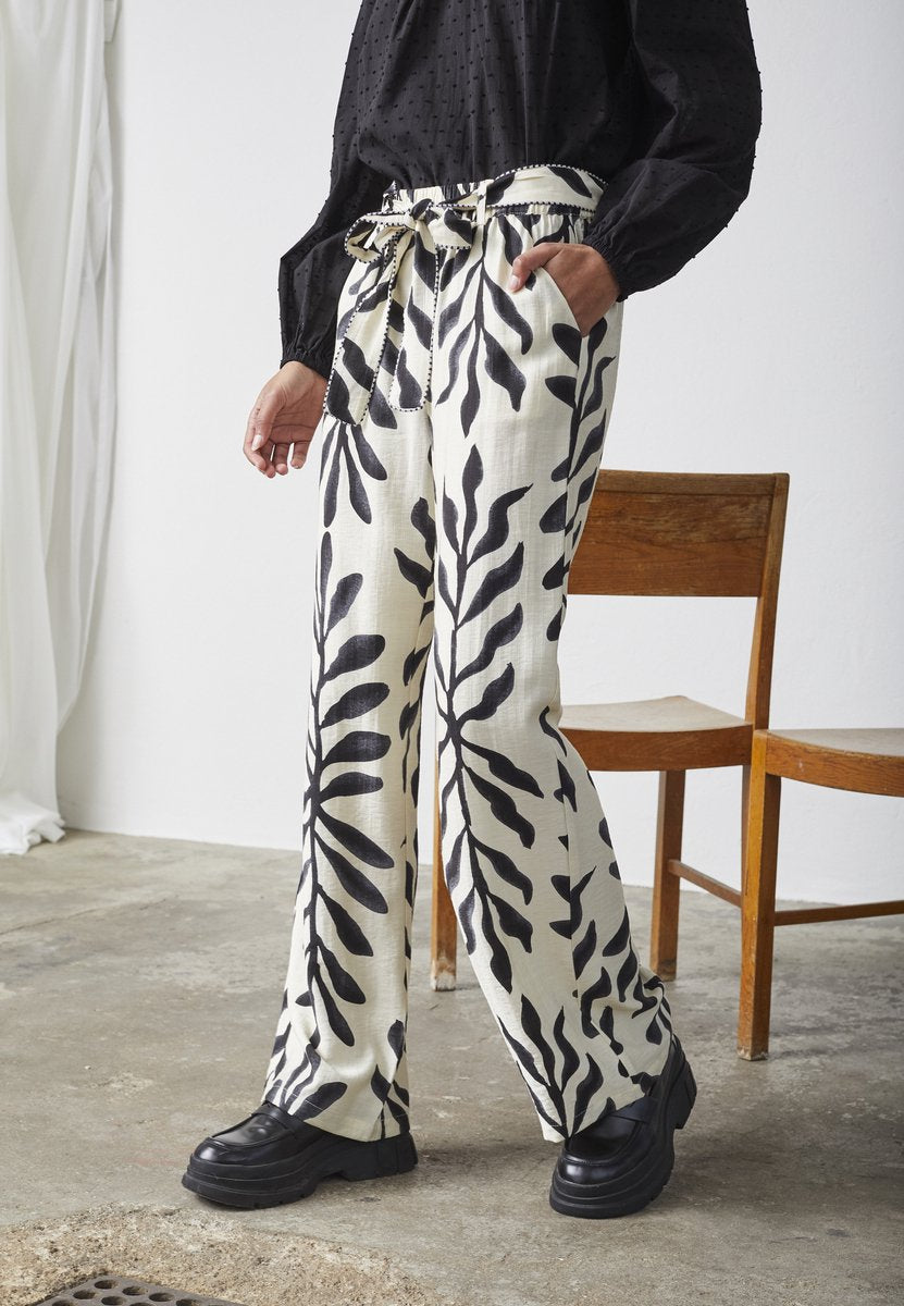 ELLA-PA43 is een paar stijlvolle broeken met een opvallend patroon. De broeken hebben een hoge taille met een strikceintuur die de taille benadrukt. Ze hebben een comfortabele, losse pasvorm en een rechte pijp.