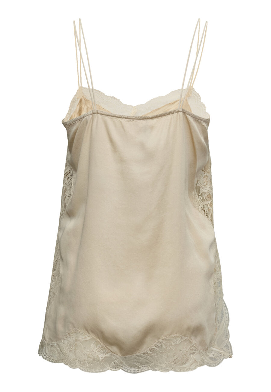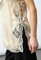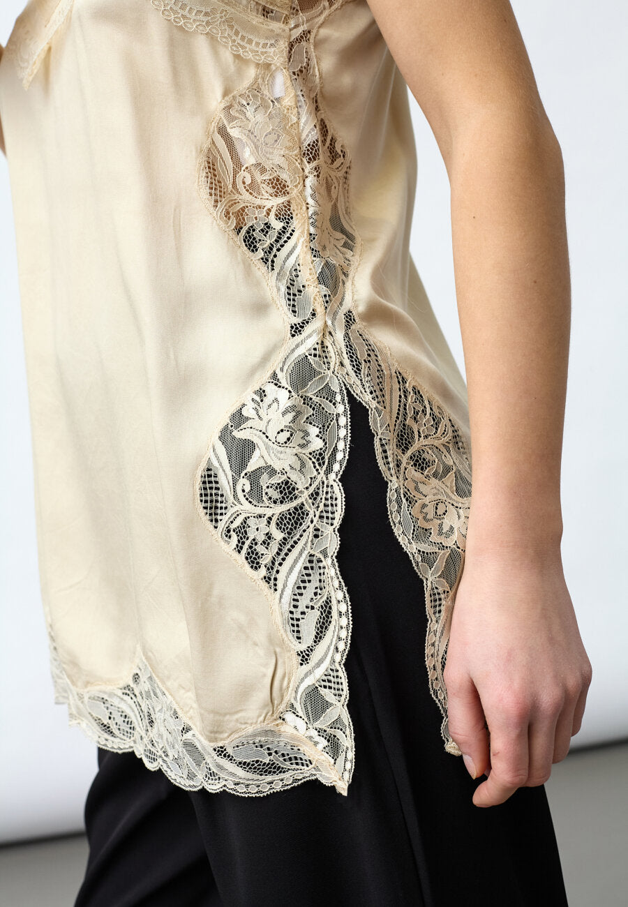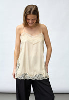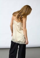 ISOLDE-ST is een exclusief satijnen topje dat is afgewerkt met een prachtige kanten rand langs de V-hals en de onderkant. Het topje heeft dunne verstelbare bandjes.