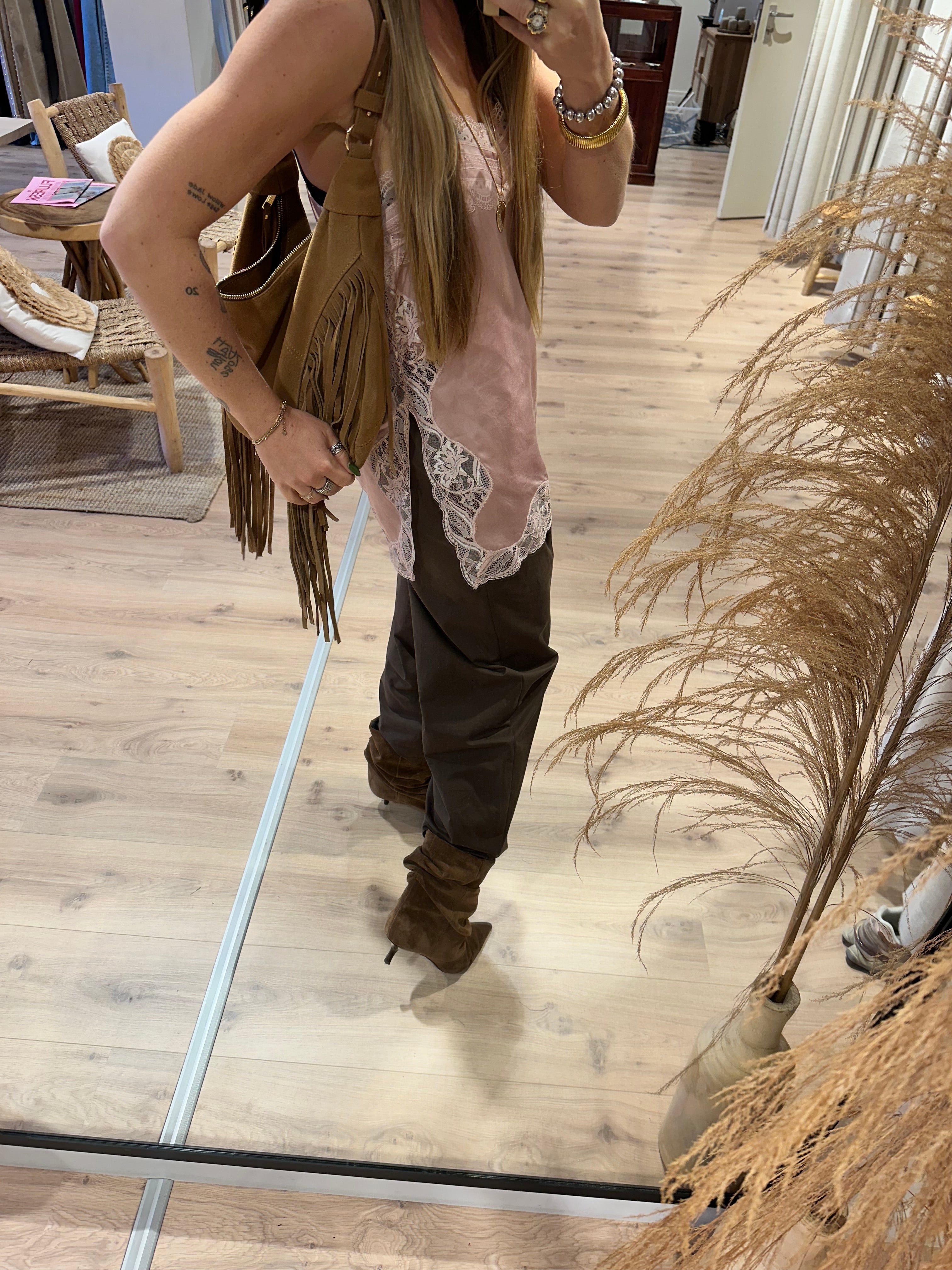 ISOLDE-ST is een exclusief satijnen topje dat is afgewerkt met een prachtige kanten rand langs de V-hals en de onderkant. Het topje heeft dunne verstelbare bandjes.