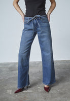 ONEA-BELT. JE2 is een blauwe denim broek met wijde pijpen en een afneembare denim riem in de taille.