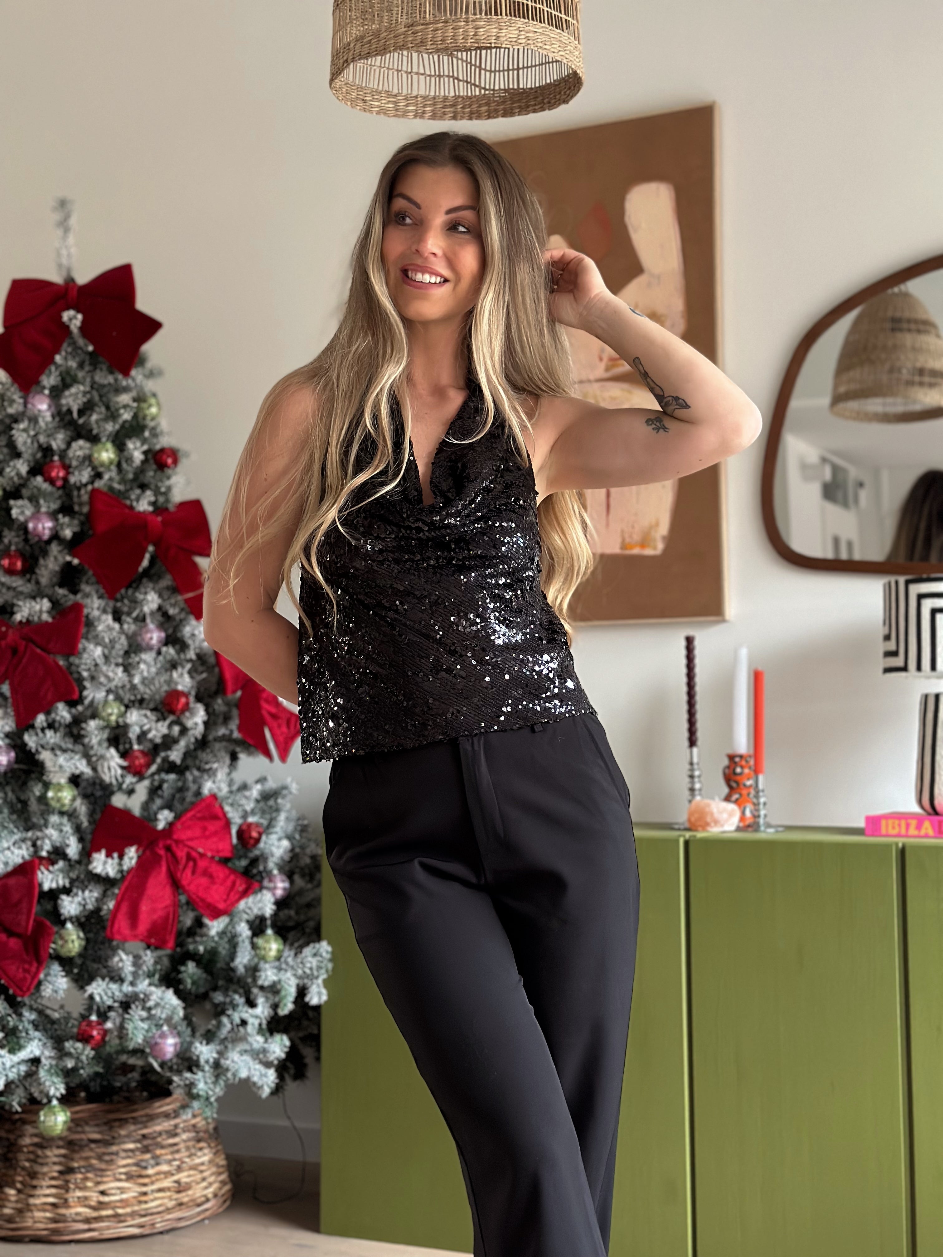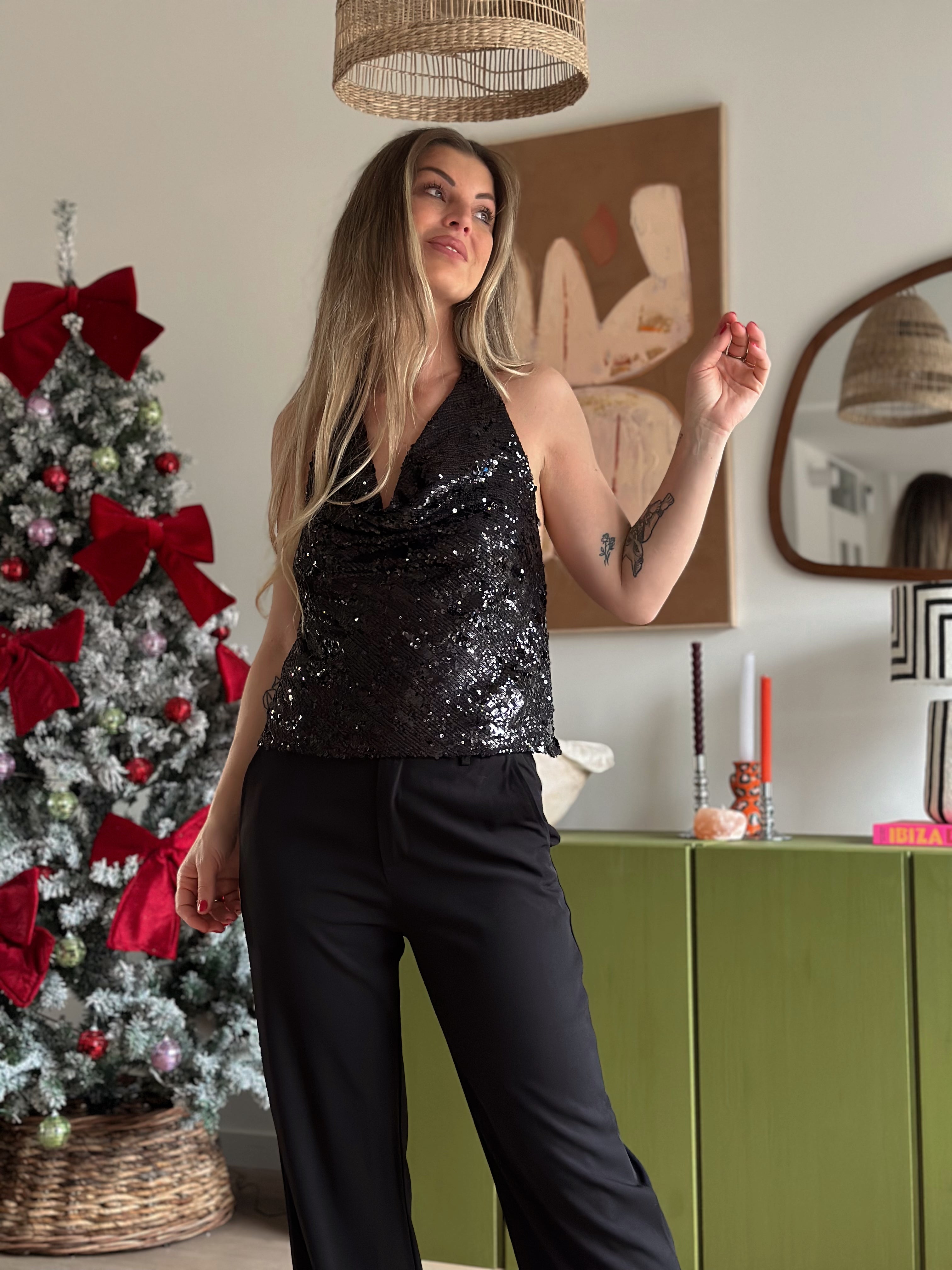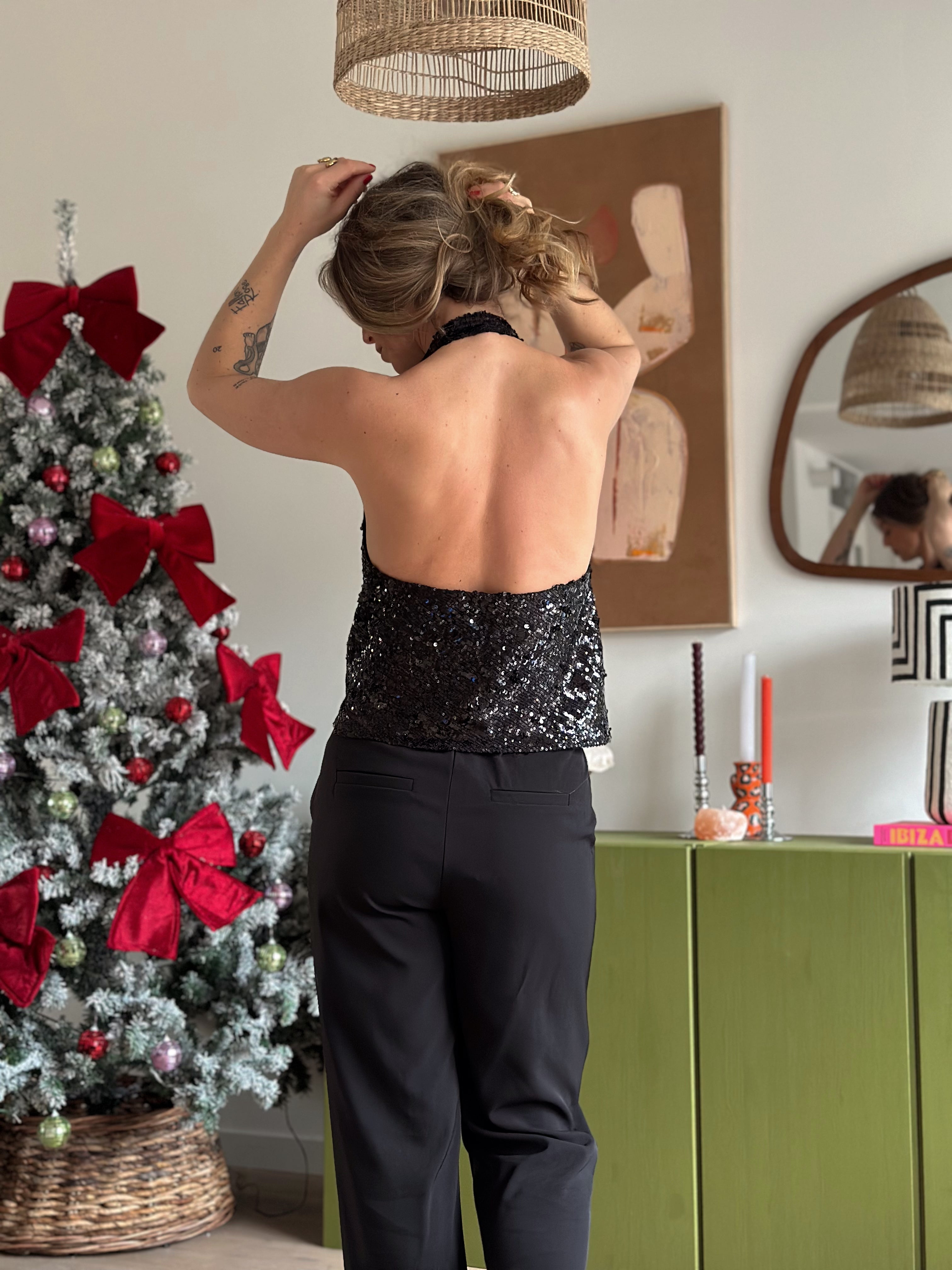 Een halter top met pailletten. De top is mouwloos en een cropped model.