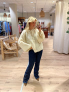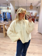 Een gebreid vestje met lange mouwen. Het vest heeft een knoopsluiting aan de voorkant en een ronde hals.