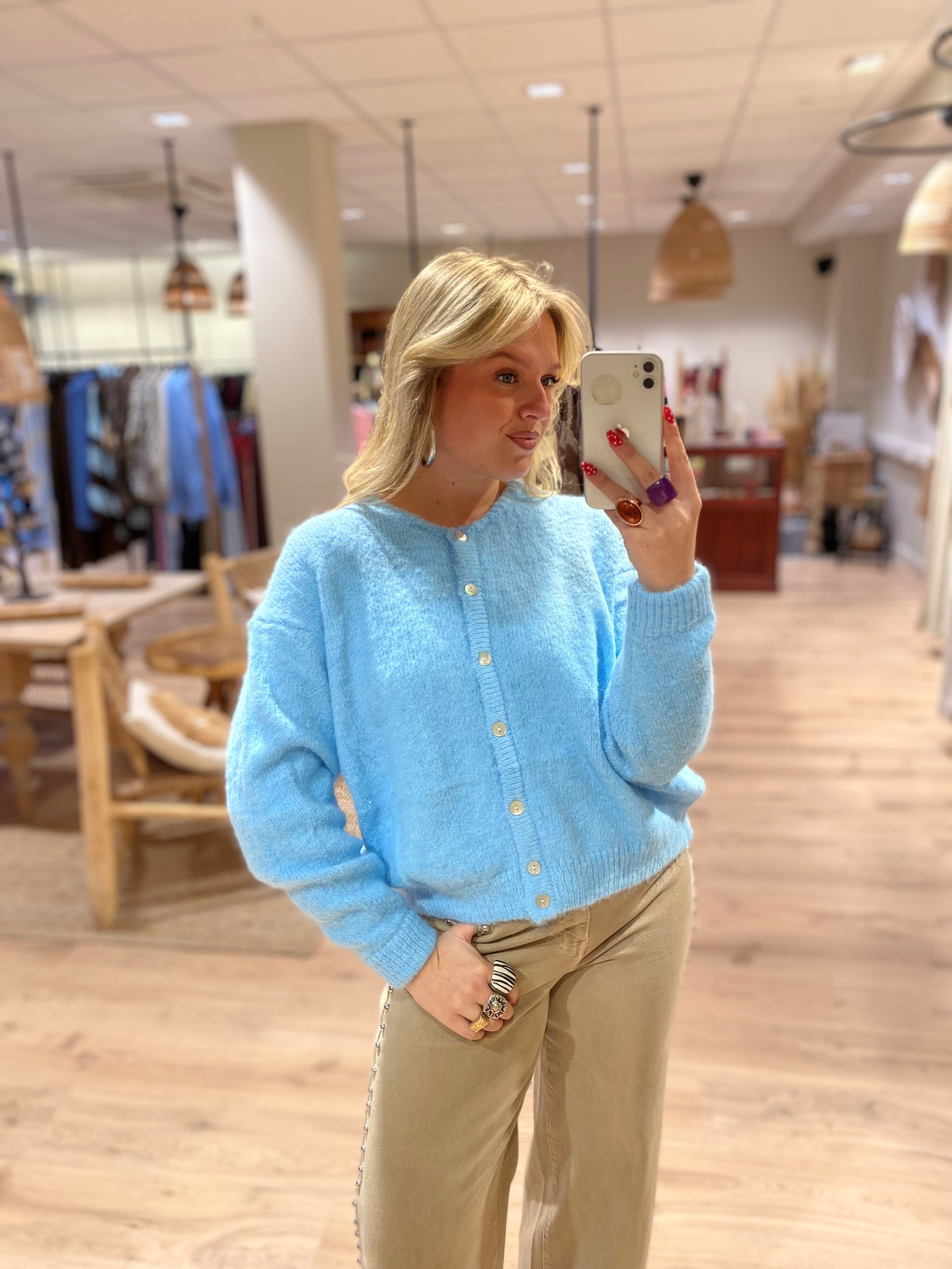 Een gebreid vestje met lange mouwen. Het vest heeft een knoopsluiting aan de voorkant en een ronde hals.