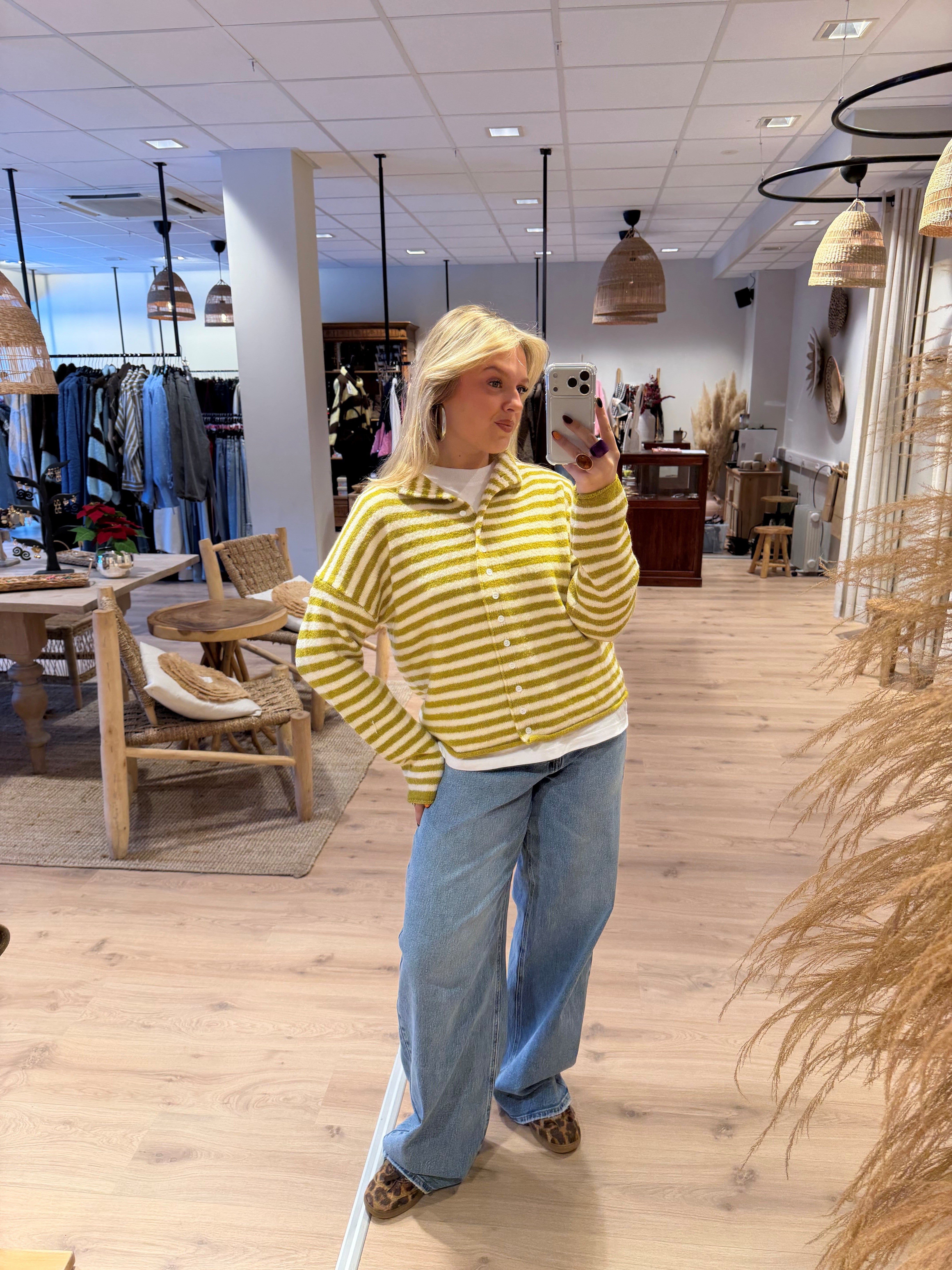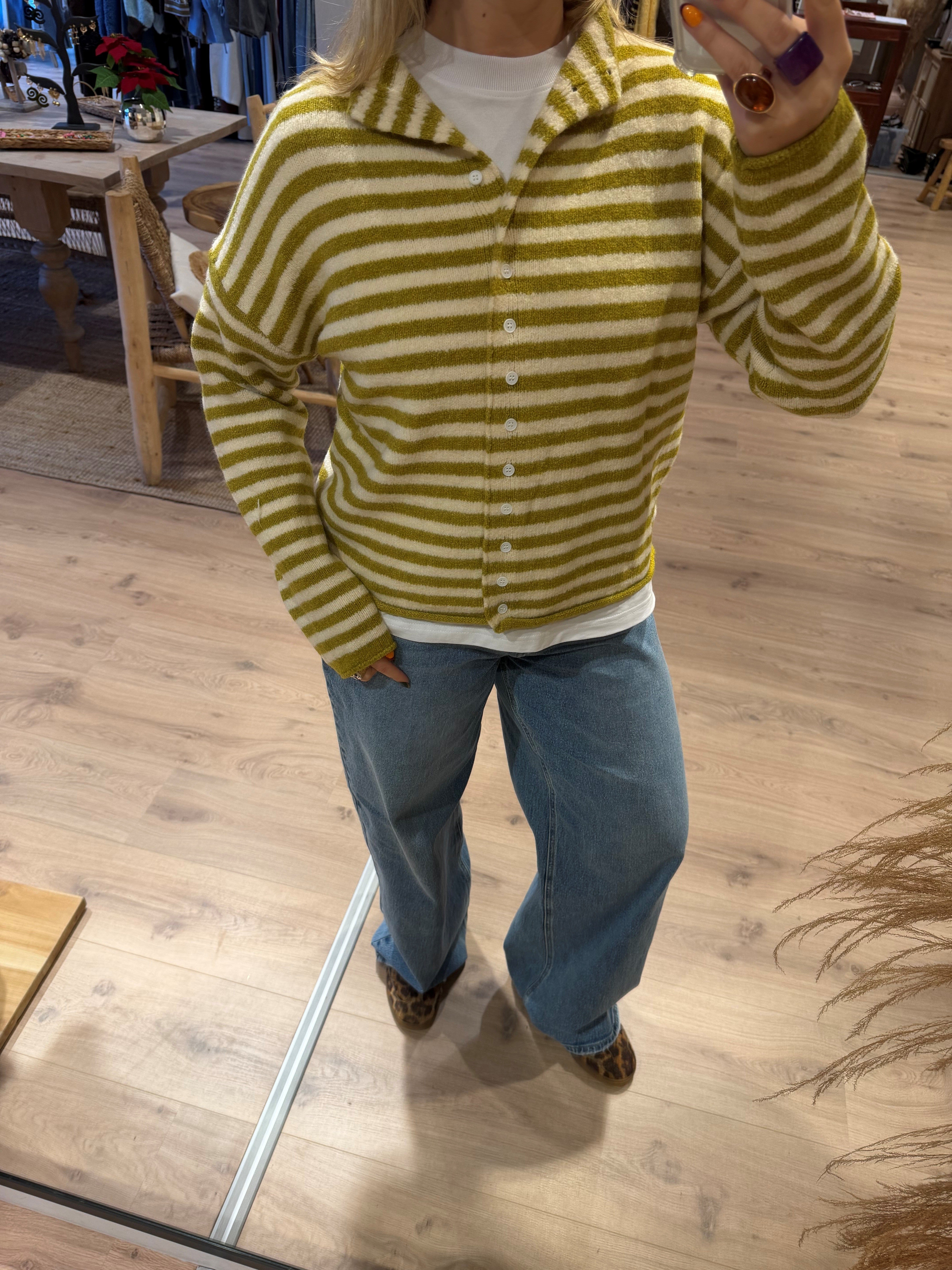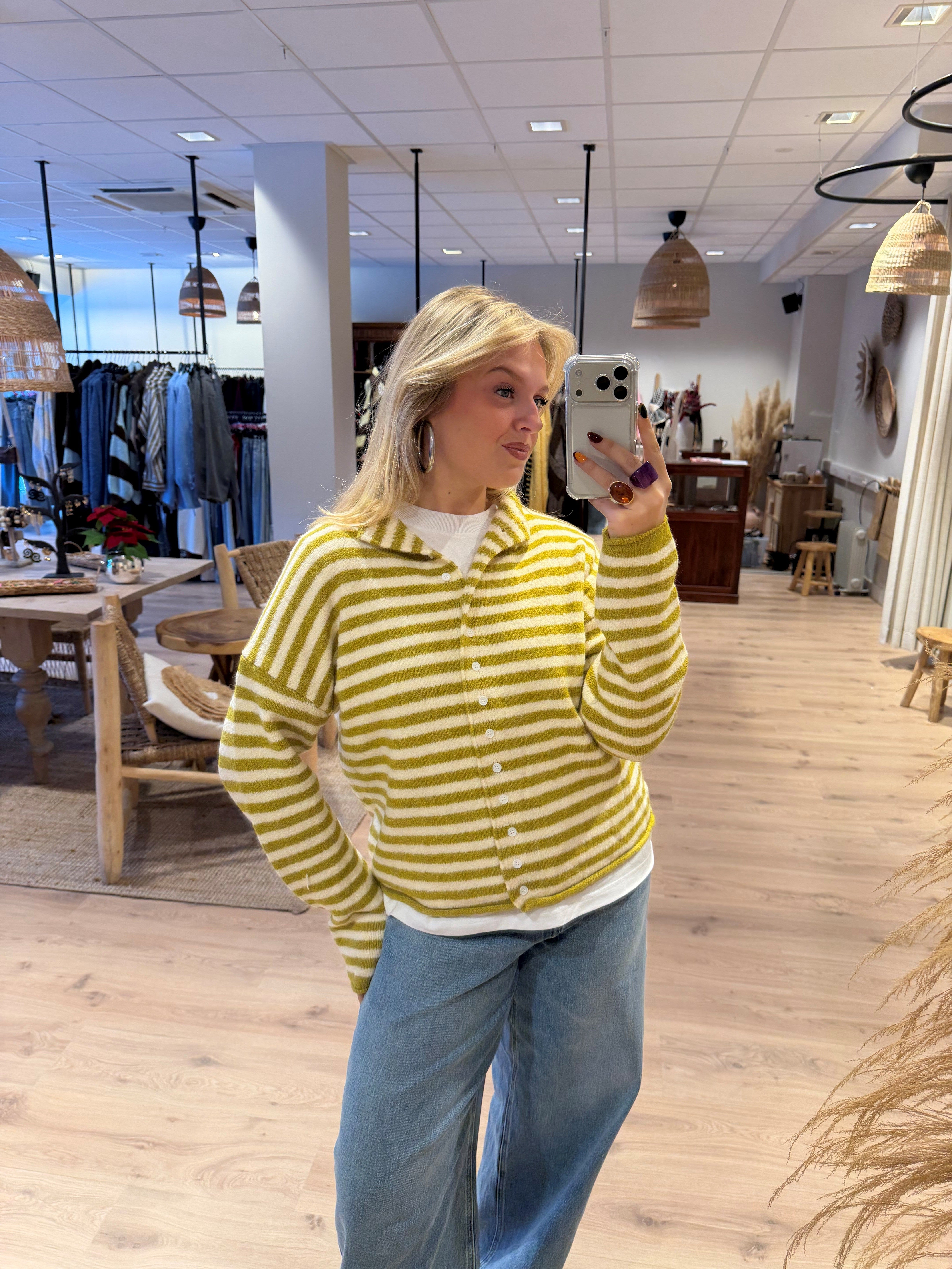 Een gebreid vest met strepen. Het vest heeft een knoopsluiting en lange mouwen.