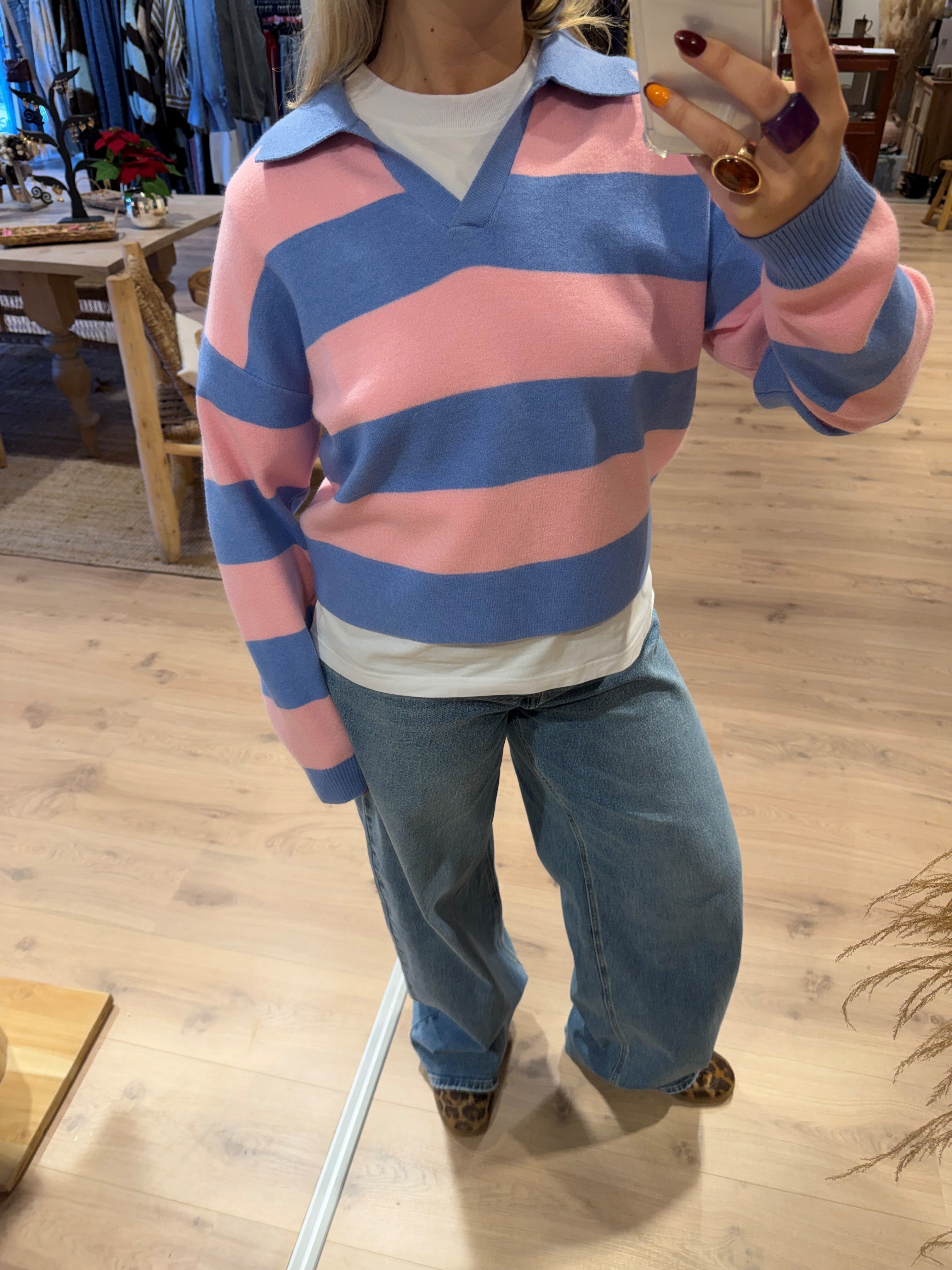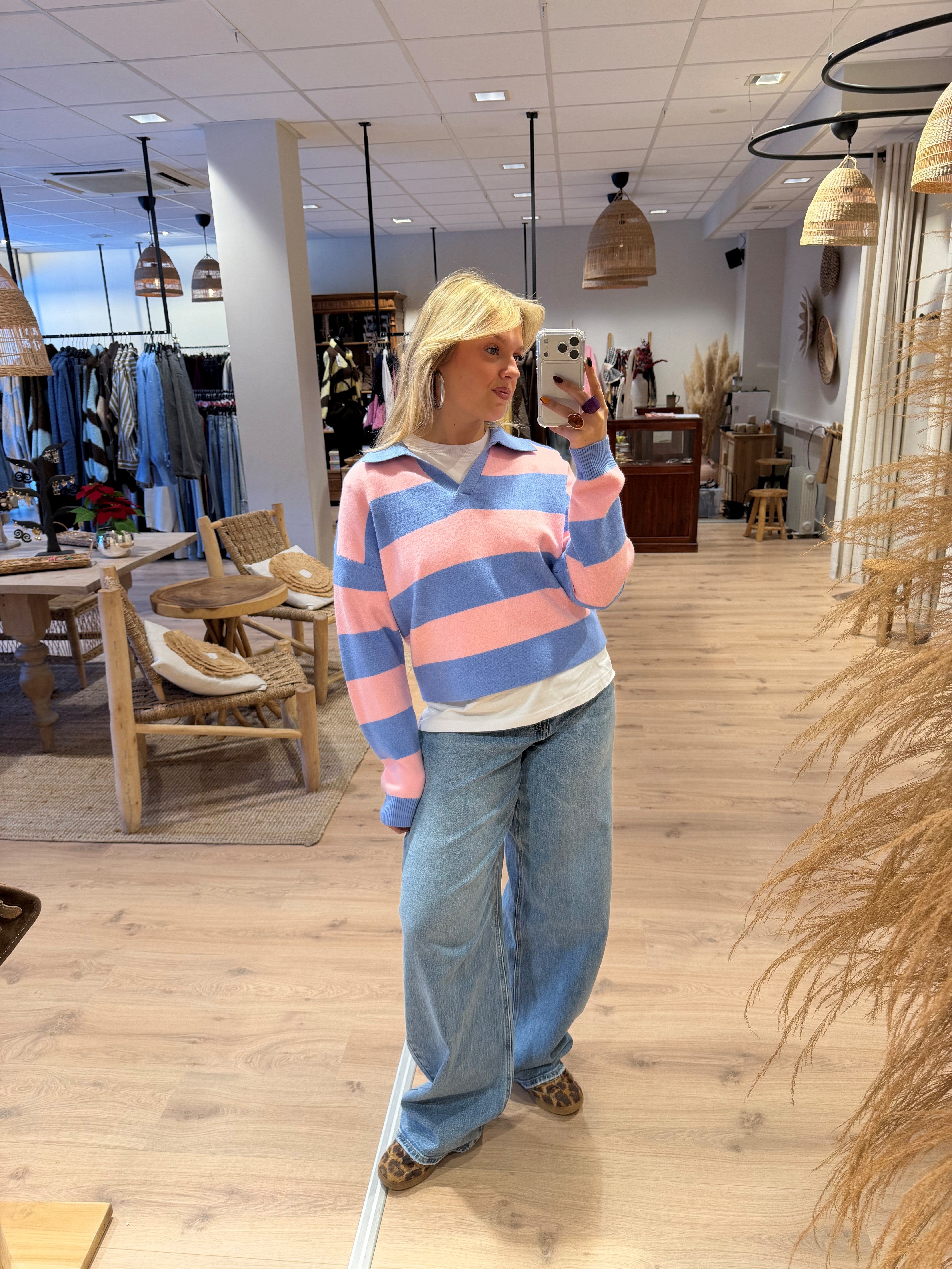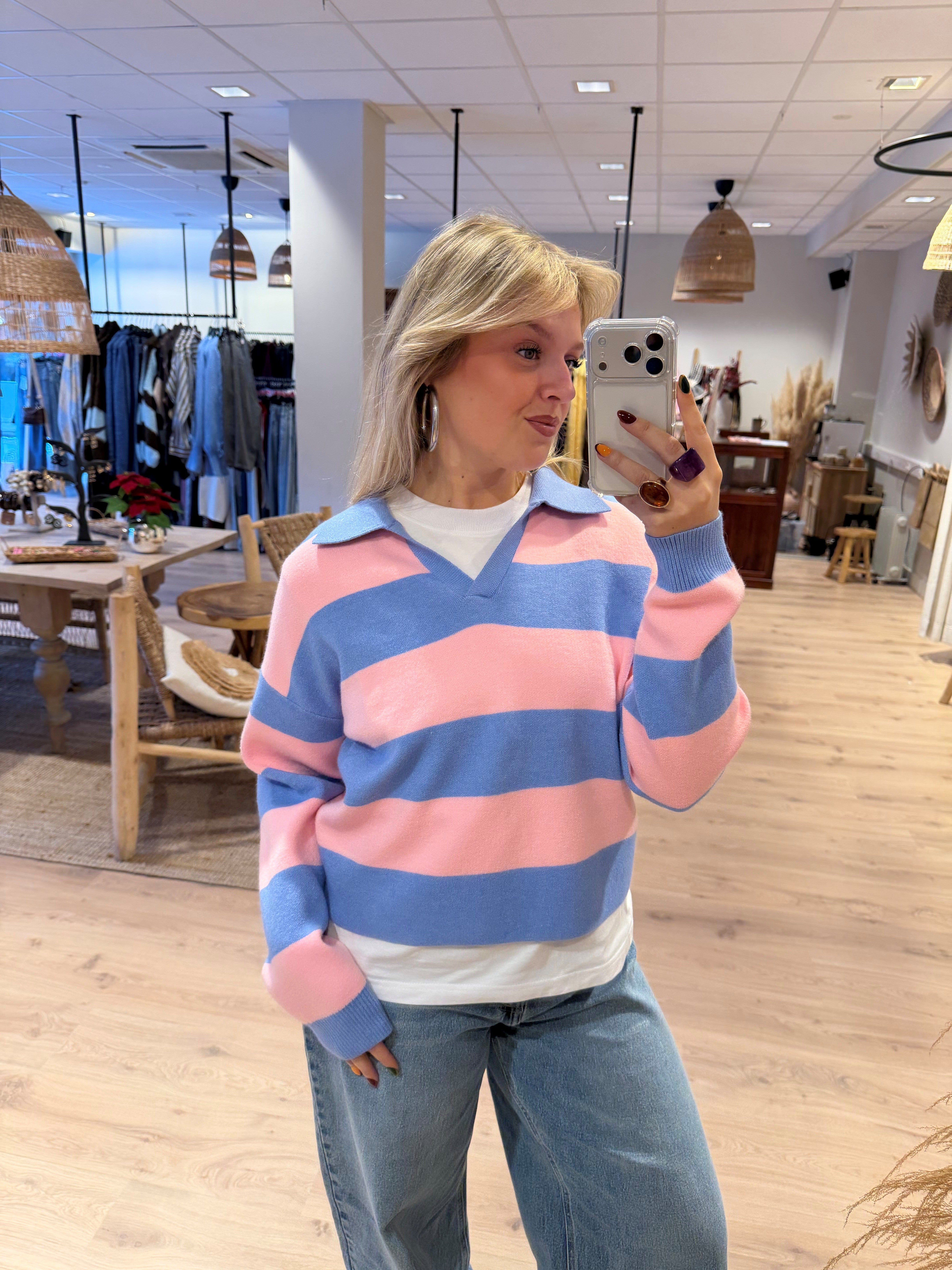 Een fijn gebreide sweater met polo kraag en strepen. De sweater heeft lange mouwen en een v-hals.