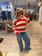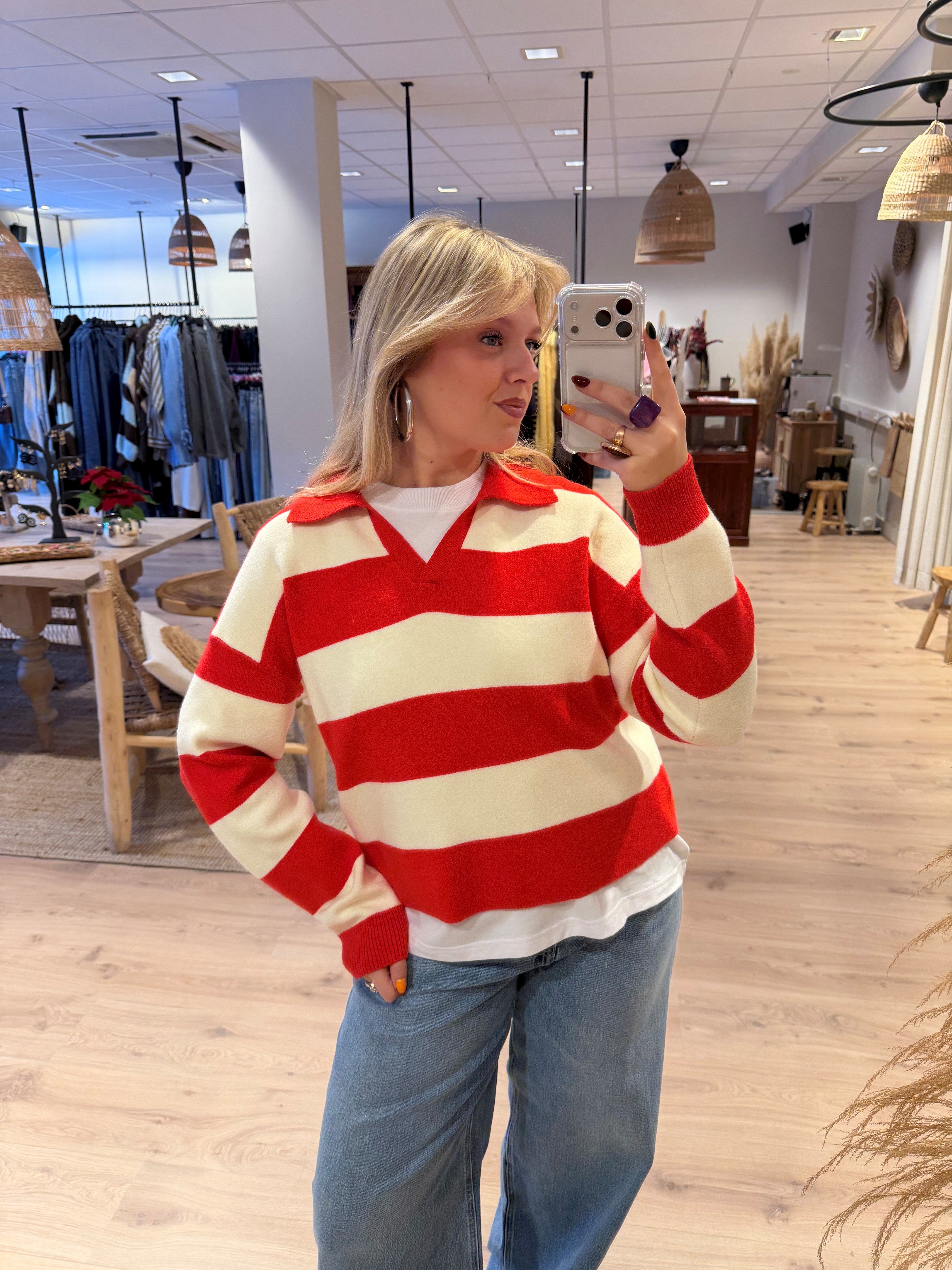 Een fijn gebreide sweater met polo kraag en strepen. De sweater heeft lange mouwen en een v-hals.