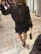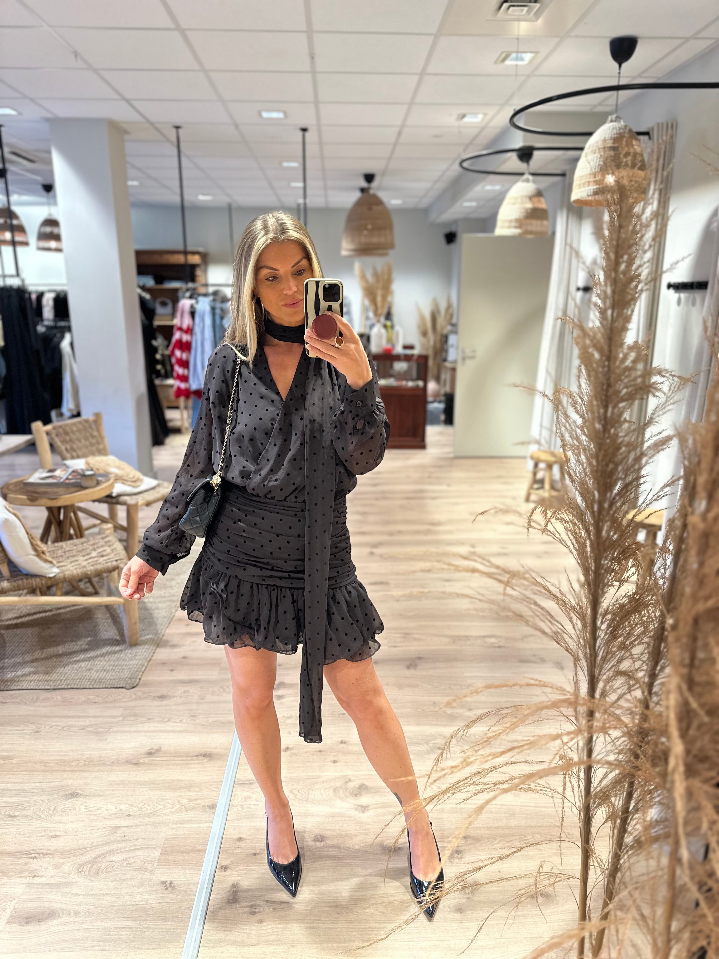 Een mini jurk met stippen print. De jurk heeft een strakke rok met een bloezend lijfje en een sjaal detail.