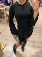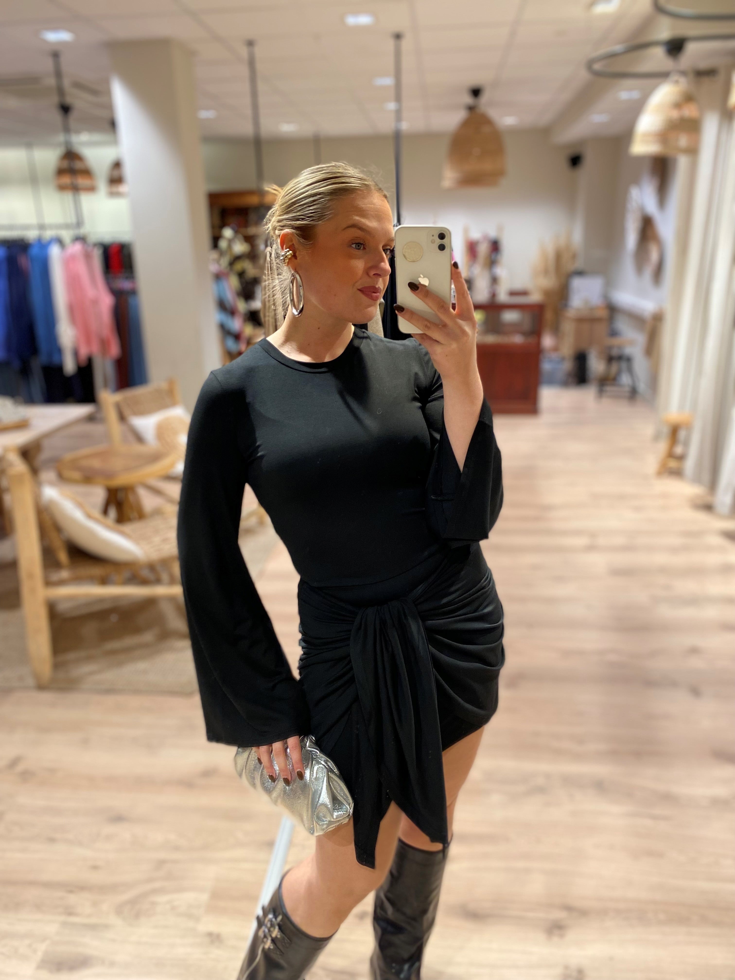 Een mini jurk met uitlopende mouwen en een knoop vooraan.