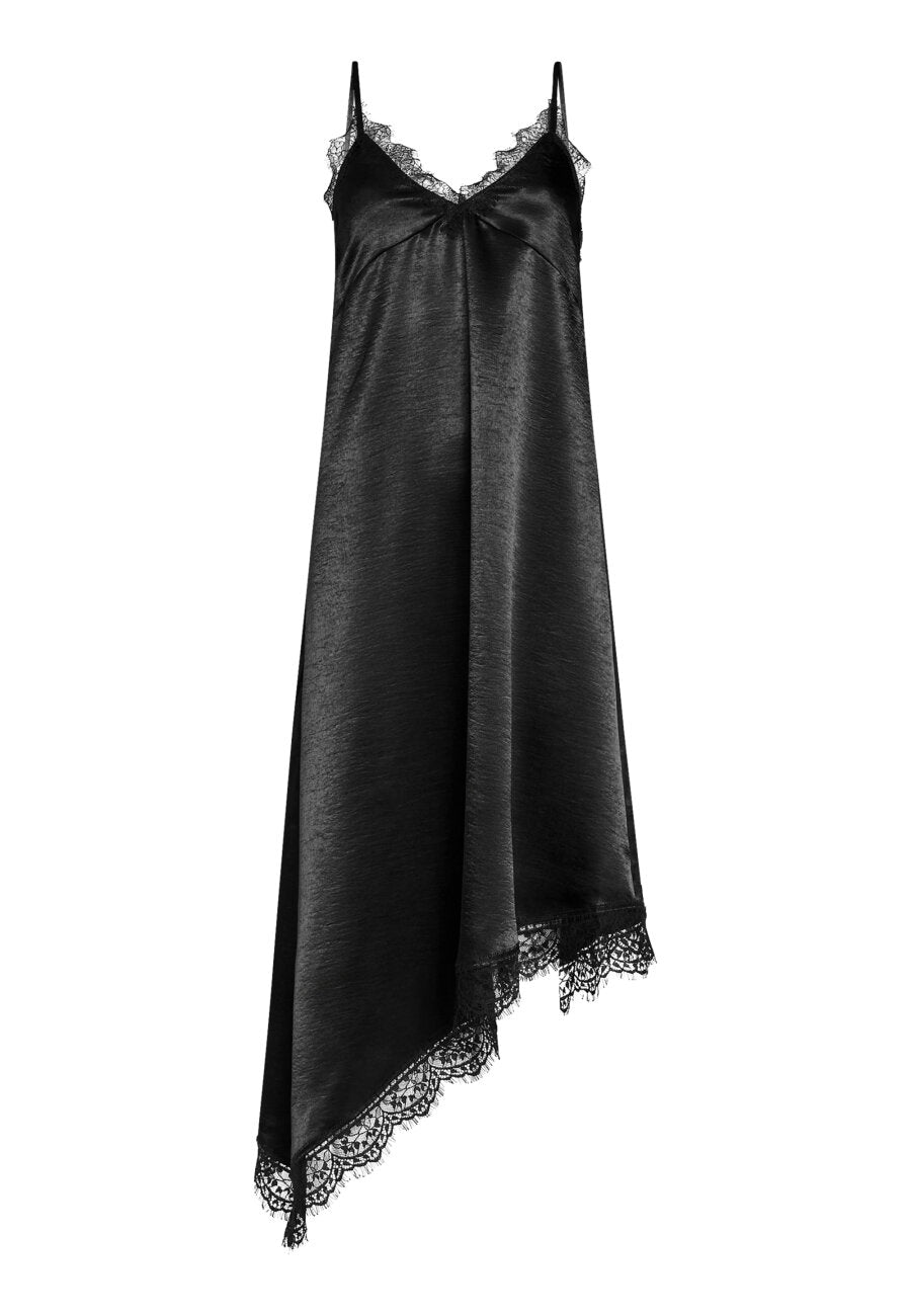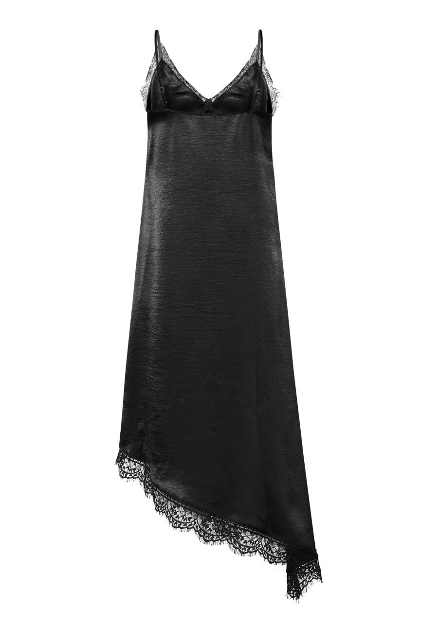 ELLEN-DR is een lange slipjurk in een glanzende satijnen look, van vloeiend materiaal met dunne, verstelbare bandjes. De jurk heeft een V-hals en een asymmetrische zoom, beide versierd met kant.