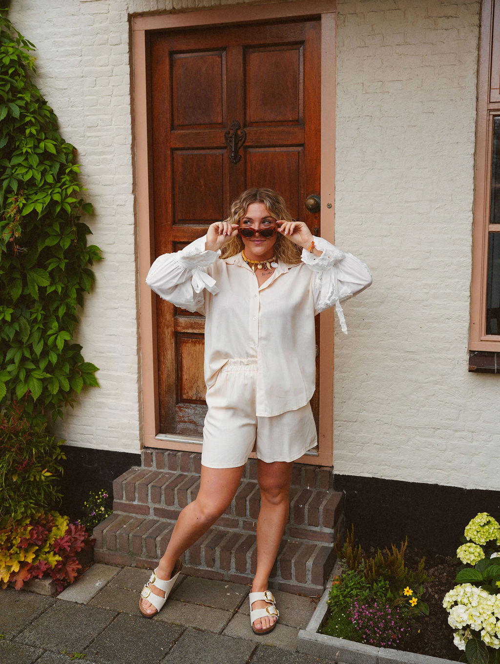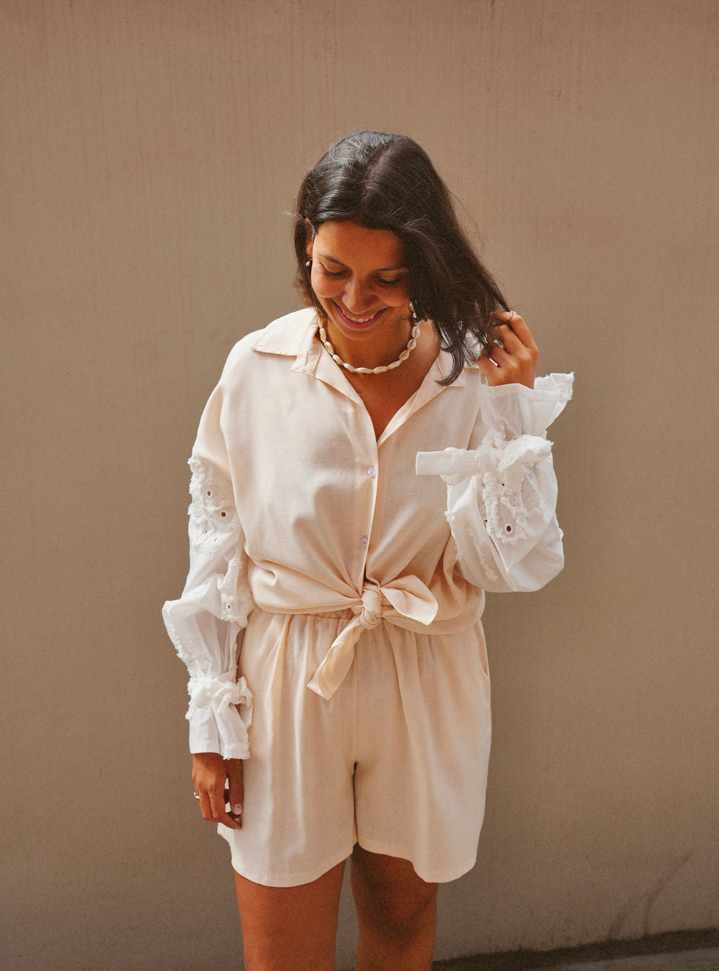 De tweedelige set bestaat uit een short met elastieken band en twee steekzakken en een blouse met lange broderie mouwen, knoopsluitingen en een ronde hals.