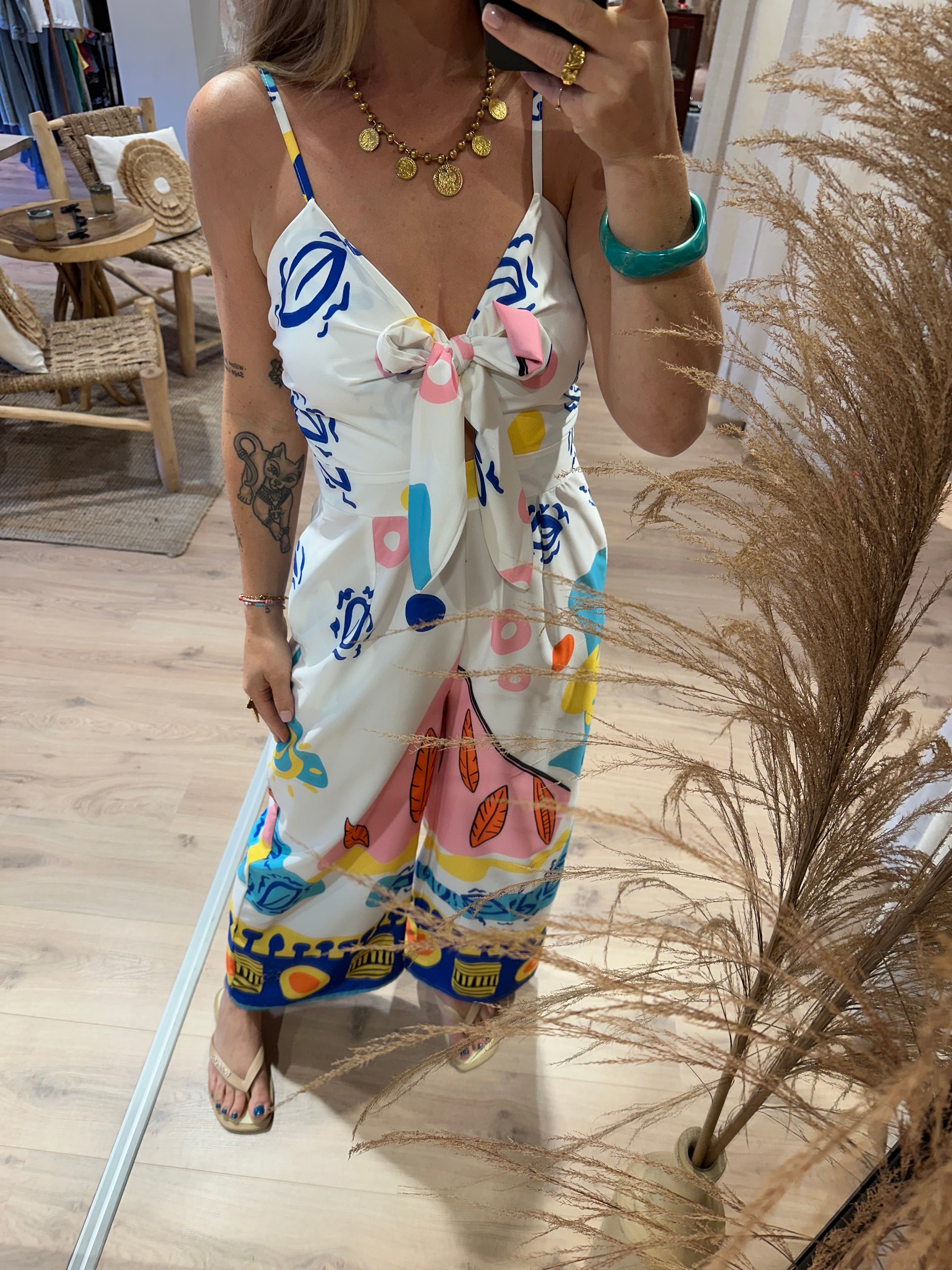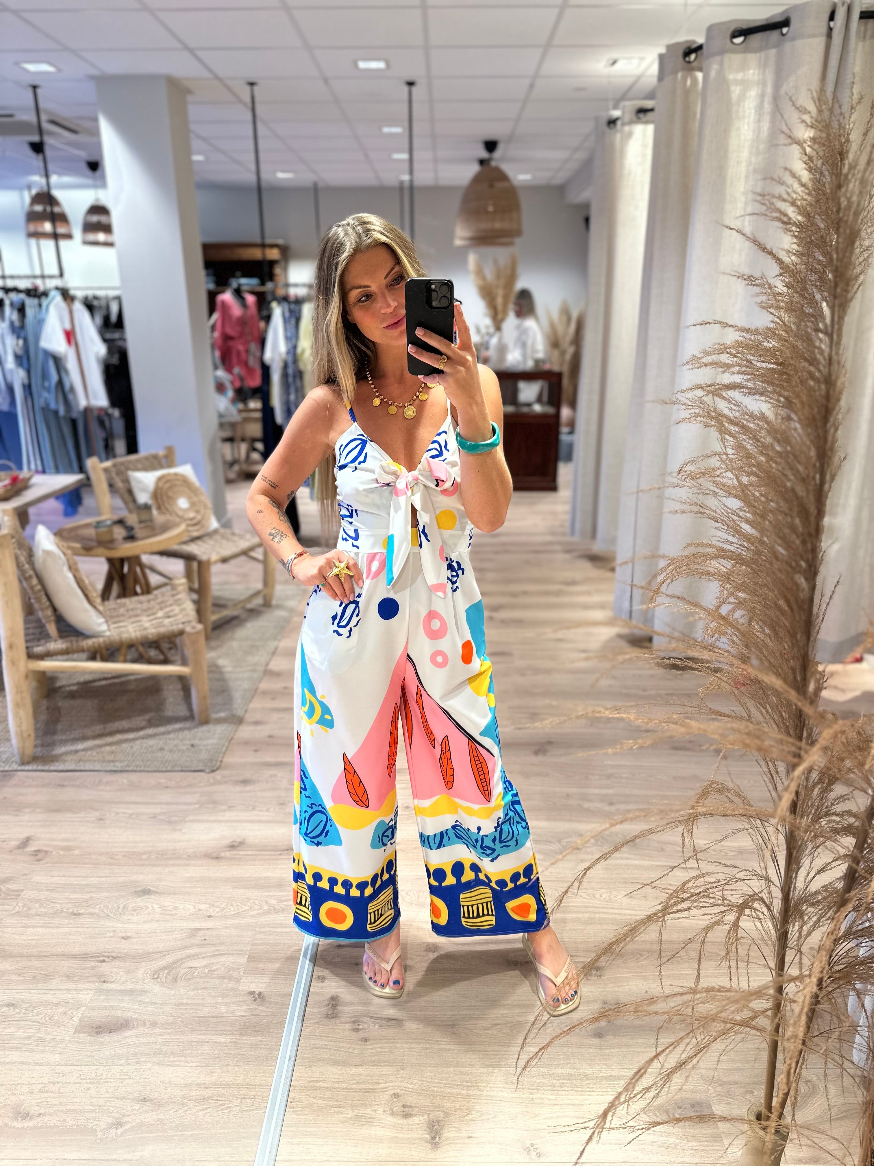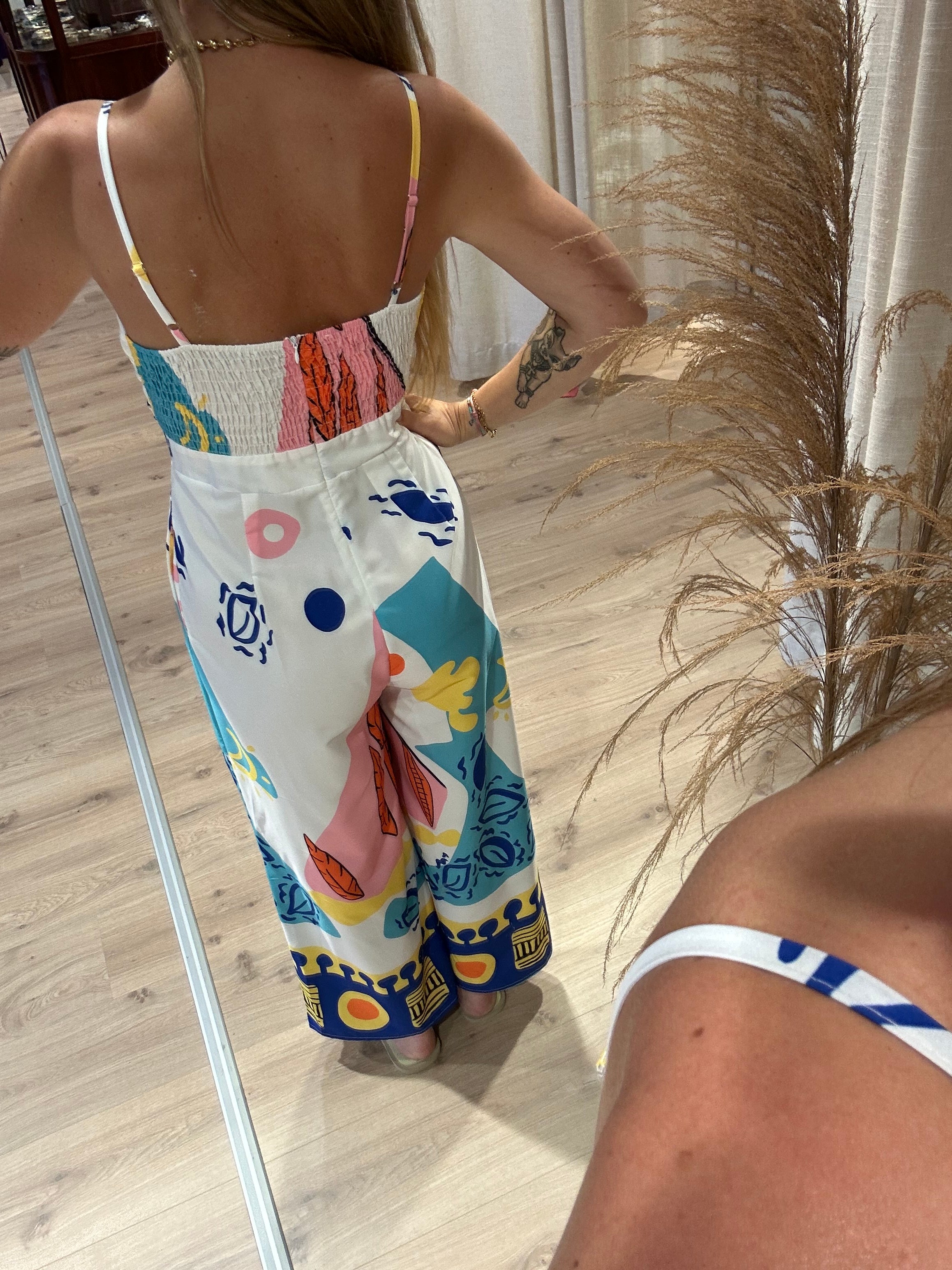 Een getailleerde jumpsuit met wijde culotte pijpen. De jumpsuit heeft verstelbare spaghettibandjes, een striksluiting aan de voorkant en heeft gesmokt elastiek aan de achterkant.