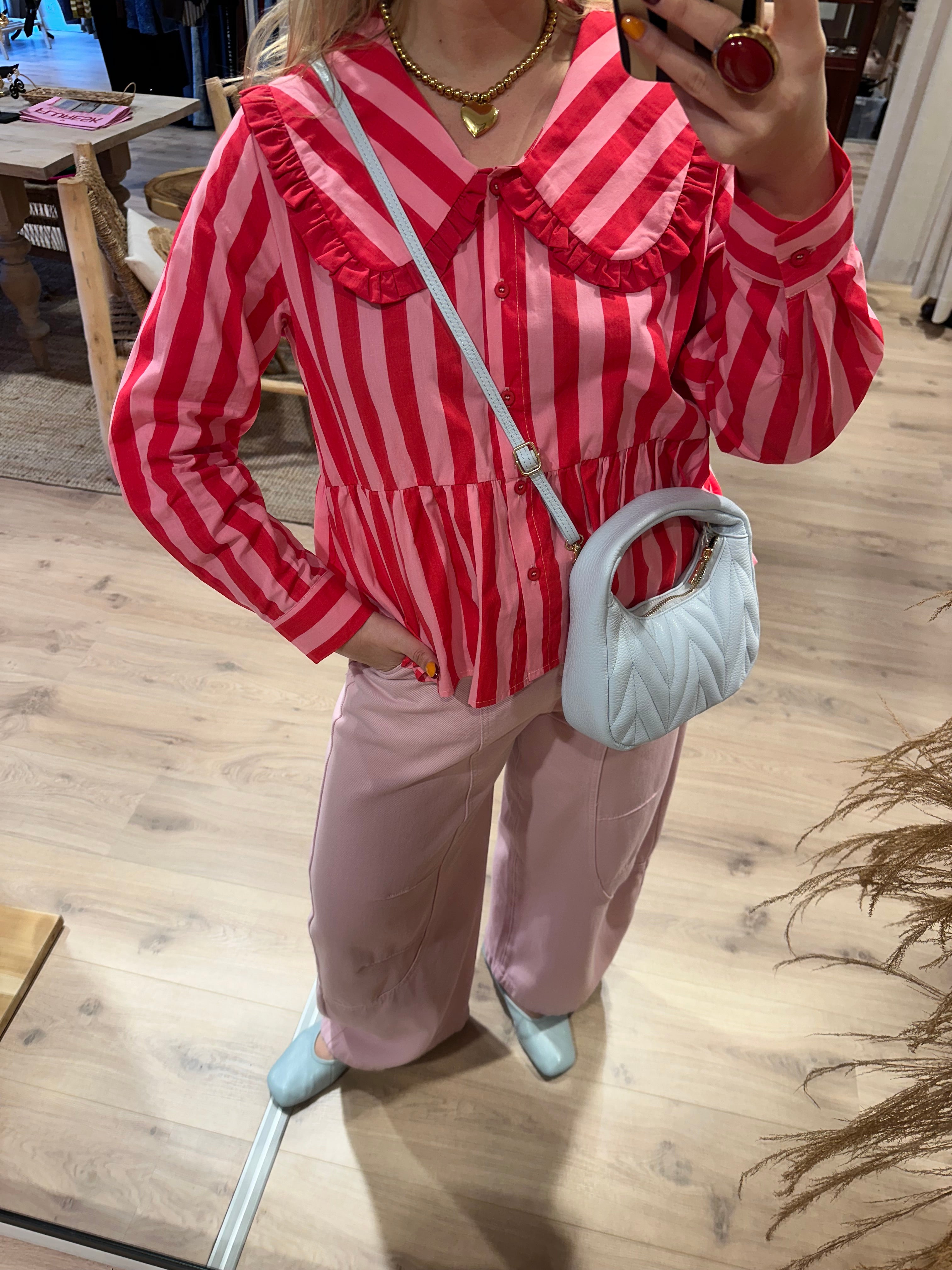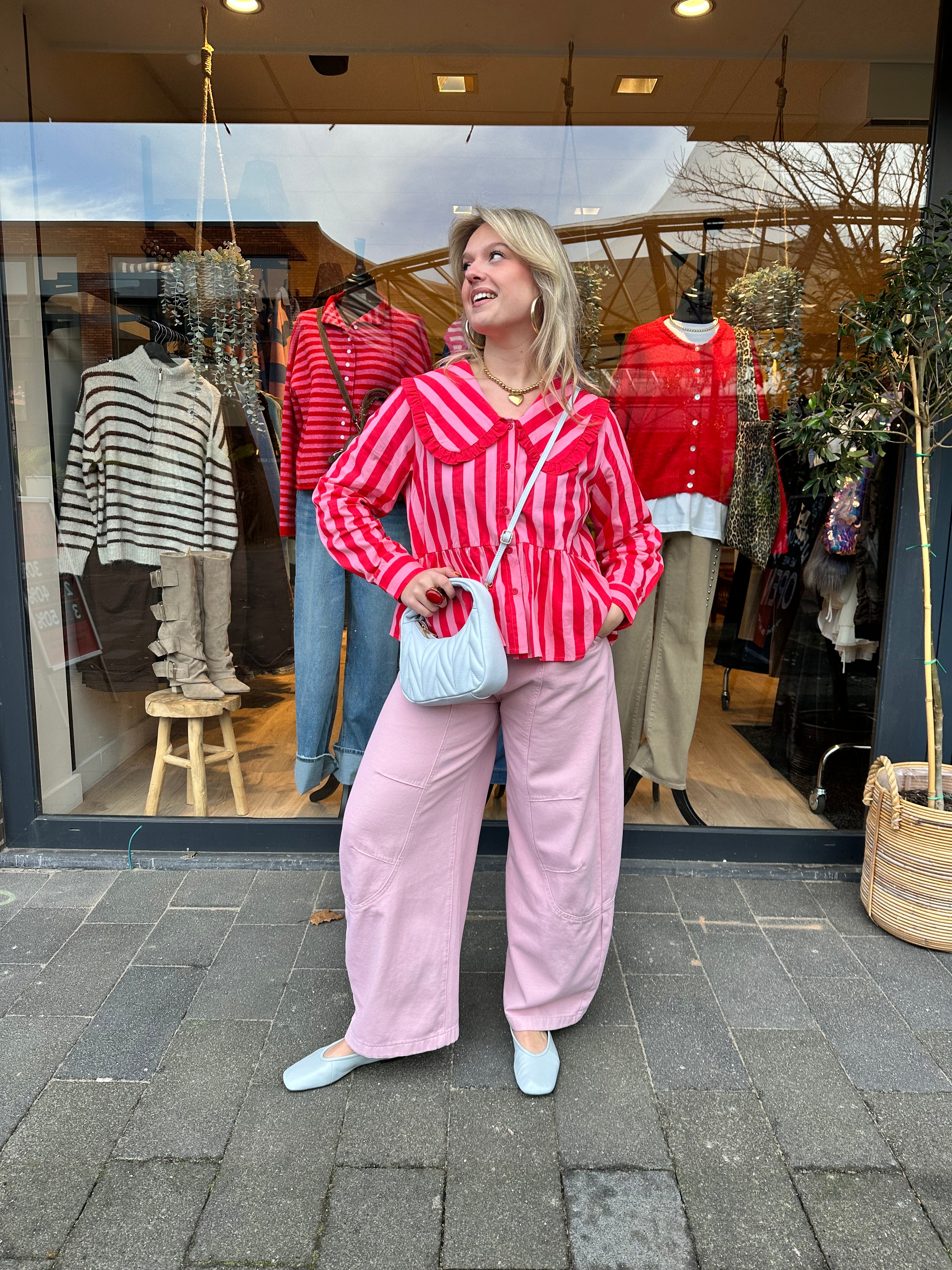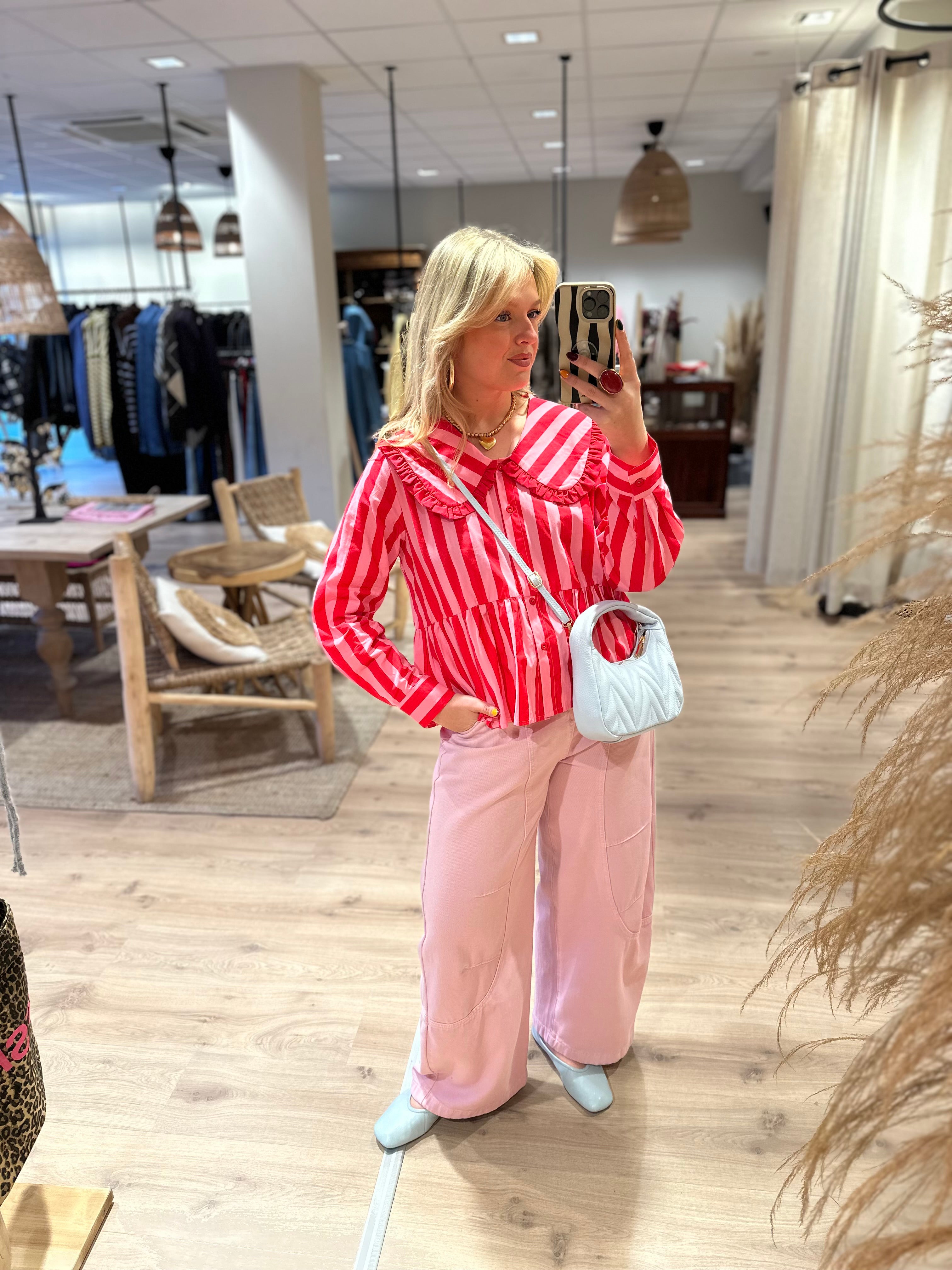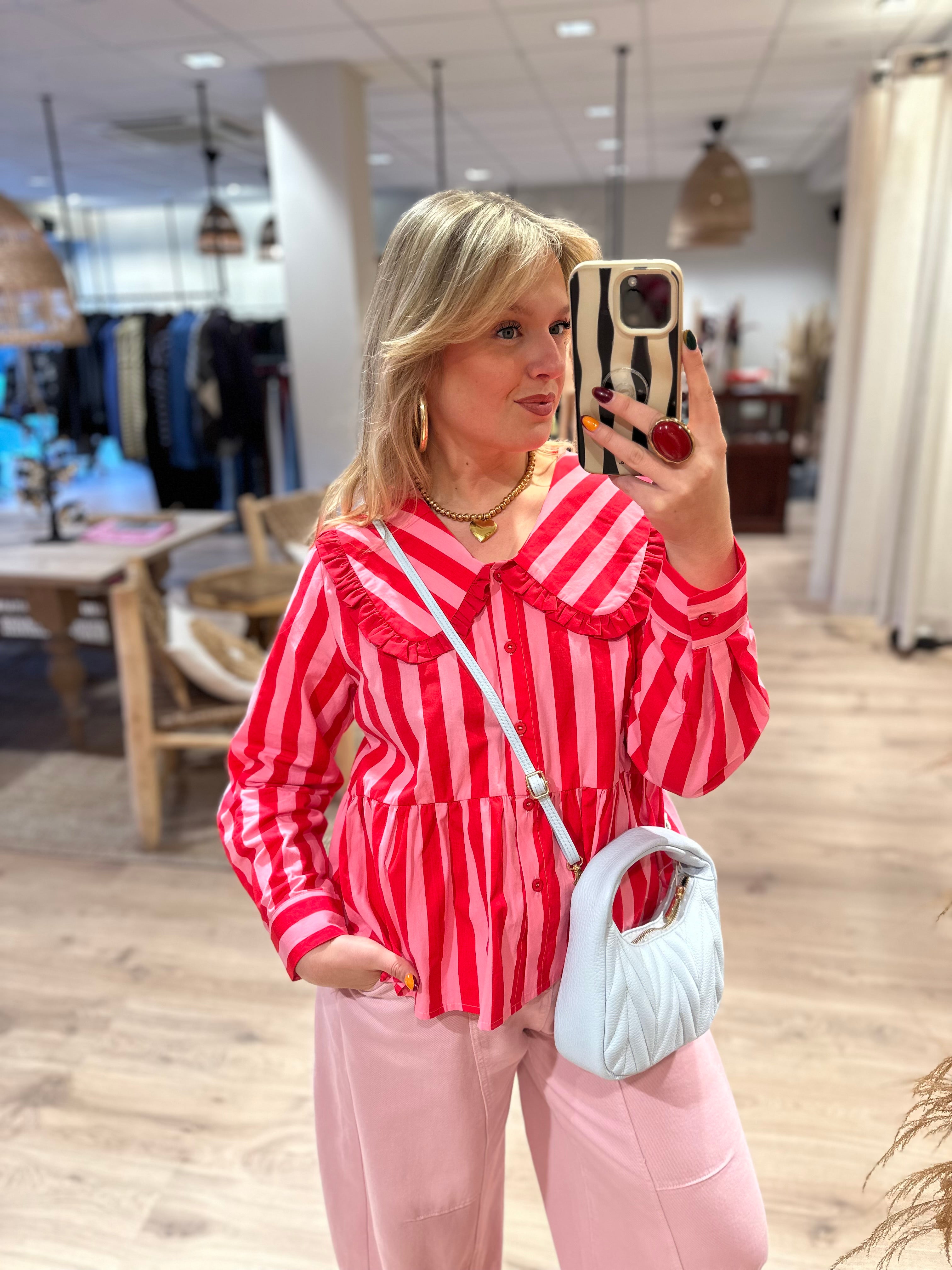 Een blouse met grote kraag en streep patroon. De blouse heeft lange mouwen en een knoopsluiting voor.