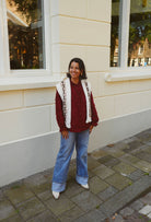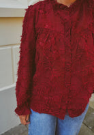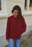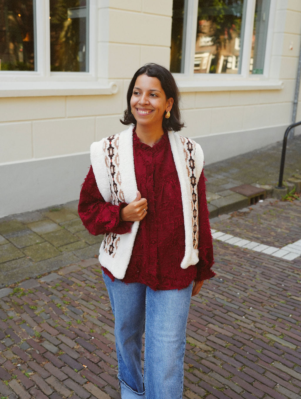De blouse heeft lange mouwen met elastieken boord, knoopsluiting aan de voorzijde en een ronde hals.