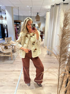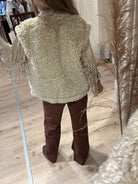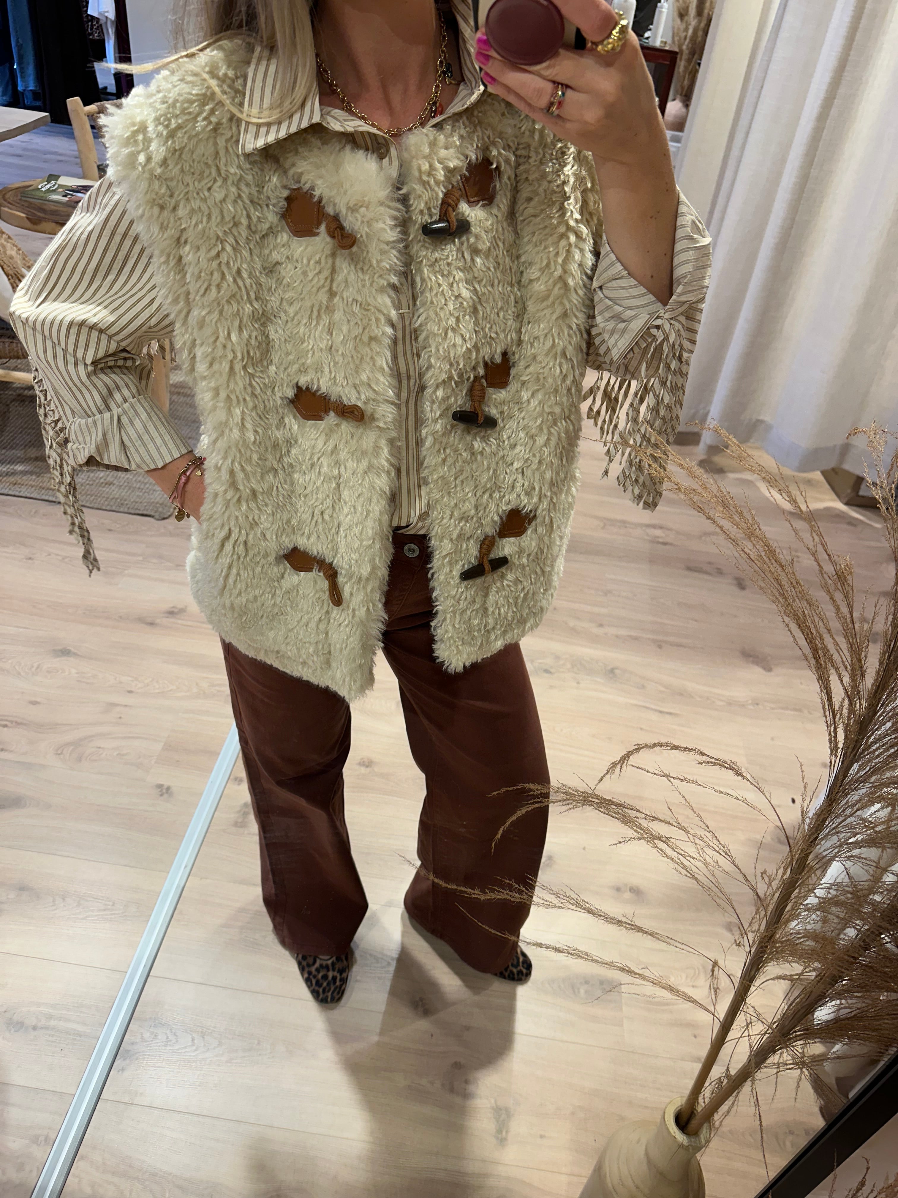 Een fluffy gilet met knoopsluiting aan de voorkant. Het gilet heeft een ronde hals en steekzakken.