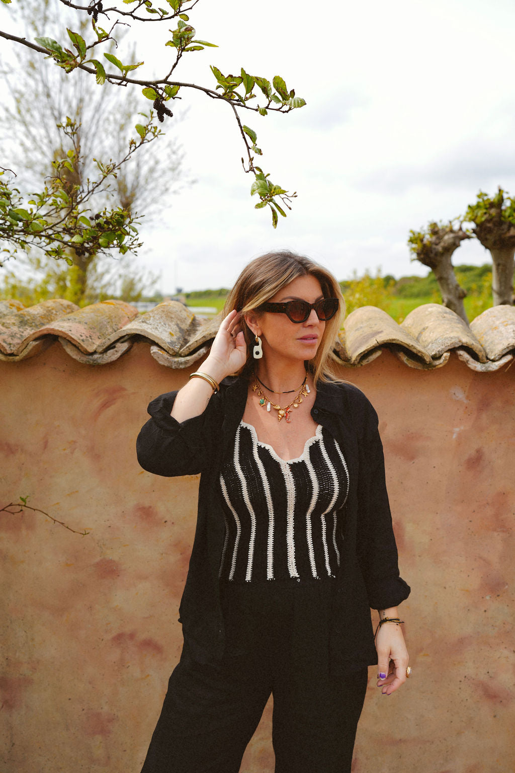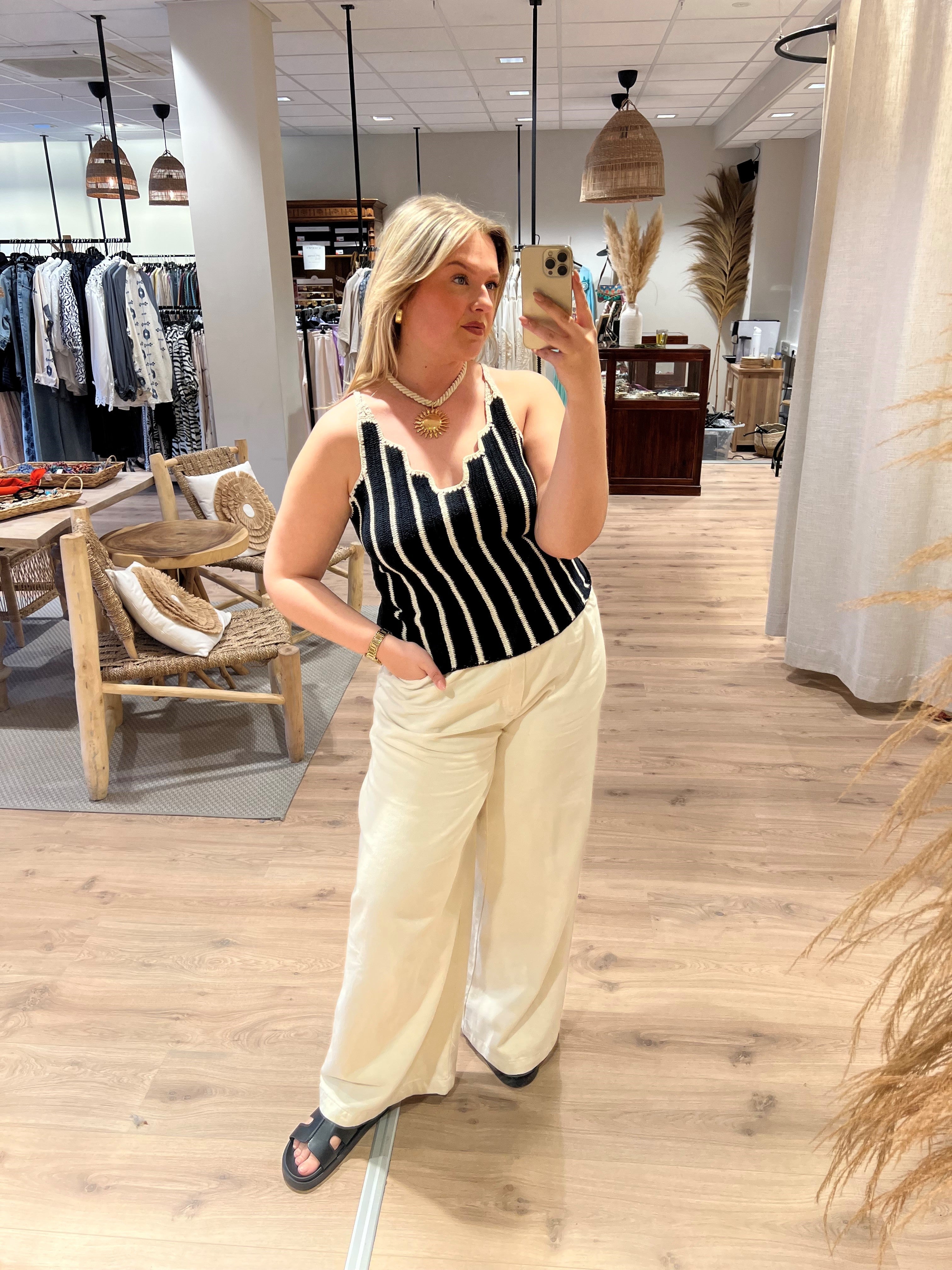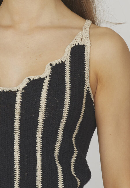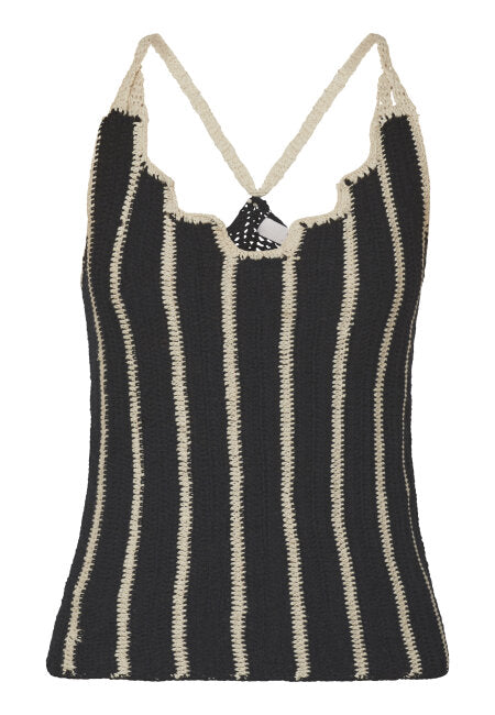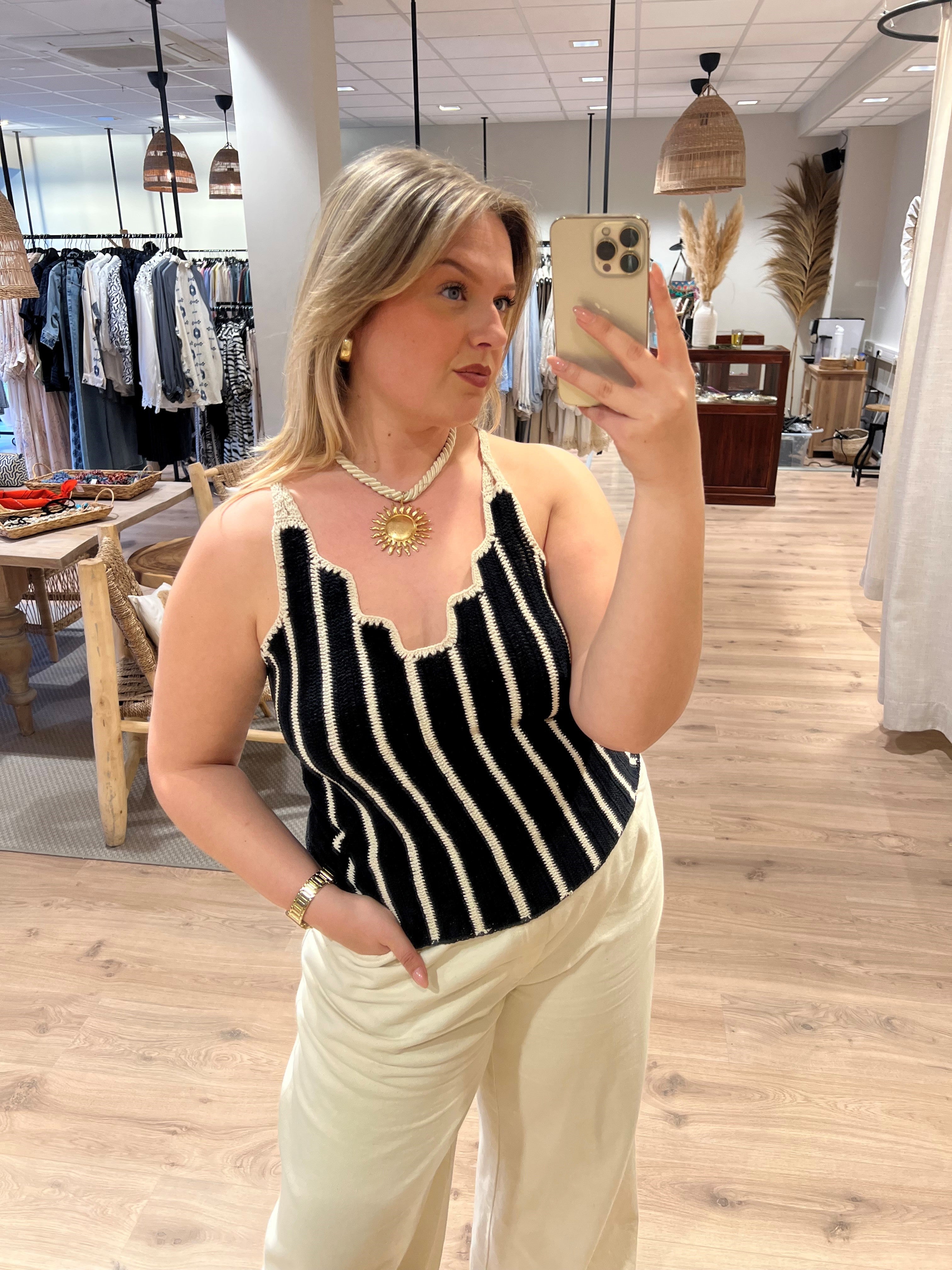 ASINA-ST is een stoere gebreide top met strepen aan de voorkant en effen aan de achterkant. De top heeft een diepe halslijn en dunne bandjes die aan de achterkant samenkomen.