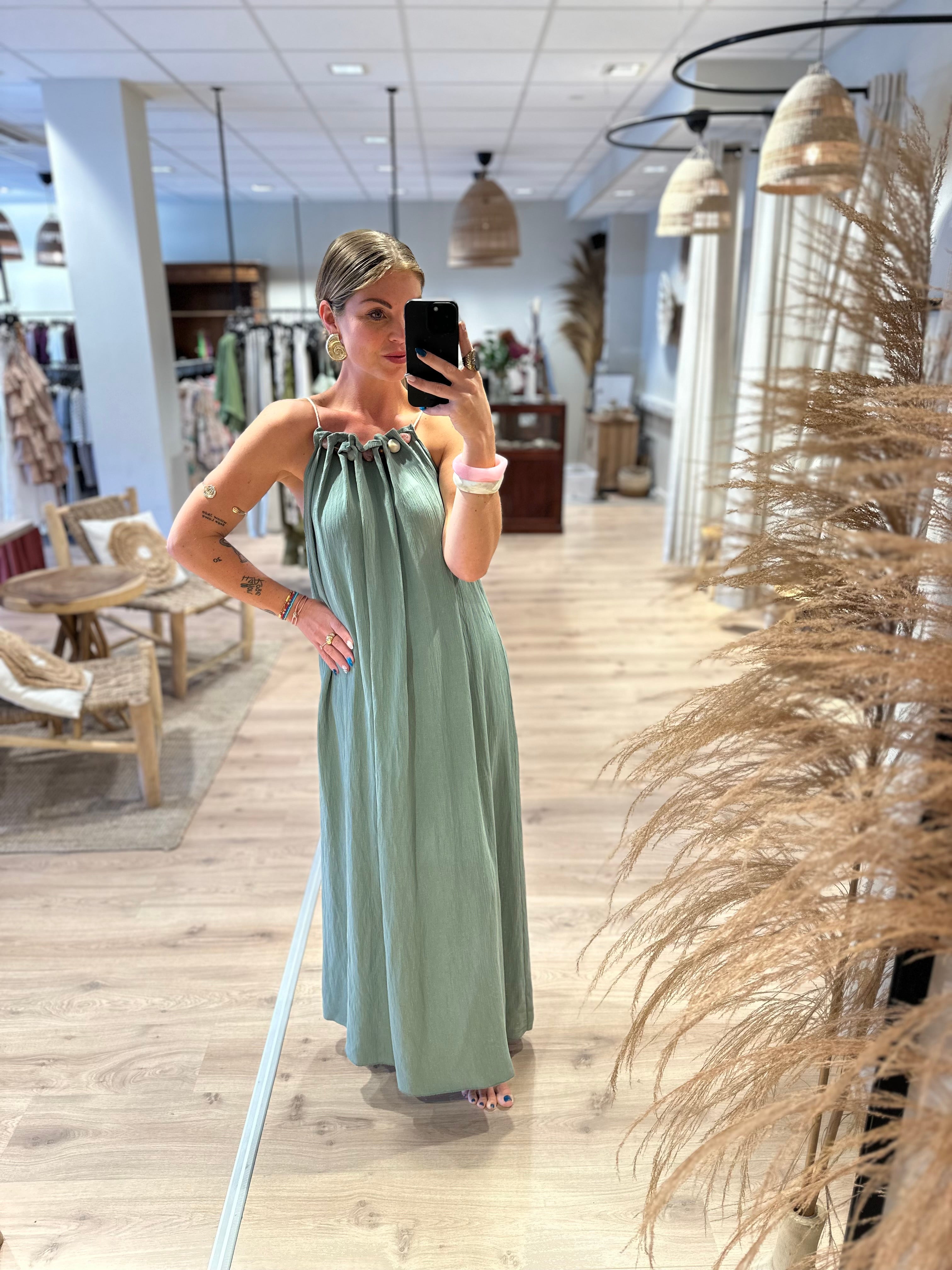 Viscose maxi jurk spaghetti bandjes en stenen groen | Loua